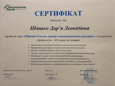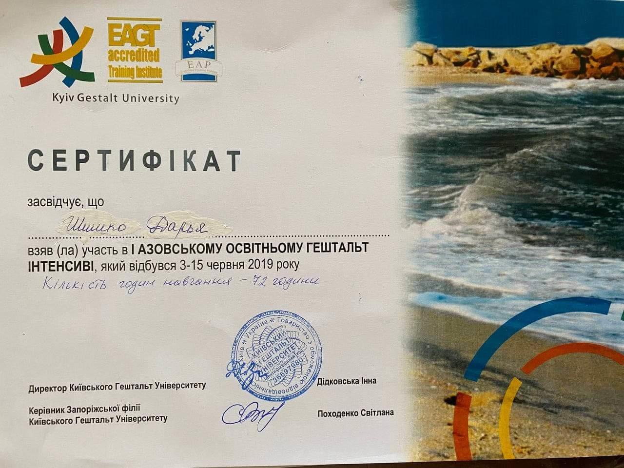 Я закінчила магістратуру за спеціальністю «Практична психологія» Київського університету Бориса Грінченка, а також другий ступень Київського Гештальт Університету тривалістю 6 років, закінчила спеціалізацію з психосоматики, спеціалізацію "Сексуальність і стосунки в парі", в також спеціалізацію по роботі з сімʼями та парами (по 1,5 роки кожна). Пройшла більше 200-т годин особистої терпії та 350 годин групової терапії, брала участь у навчальних інтенсивнах та конференціях від Гештальт Інституту.
