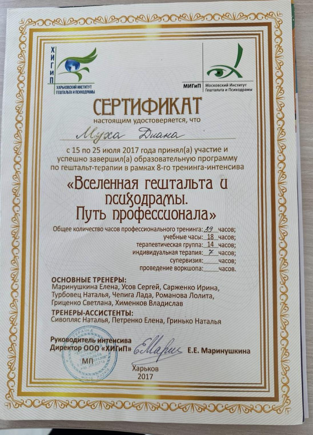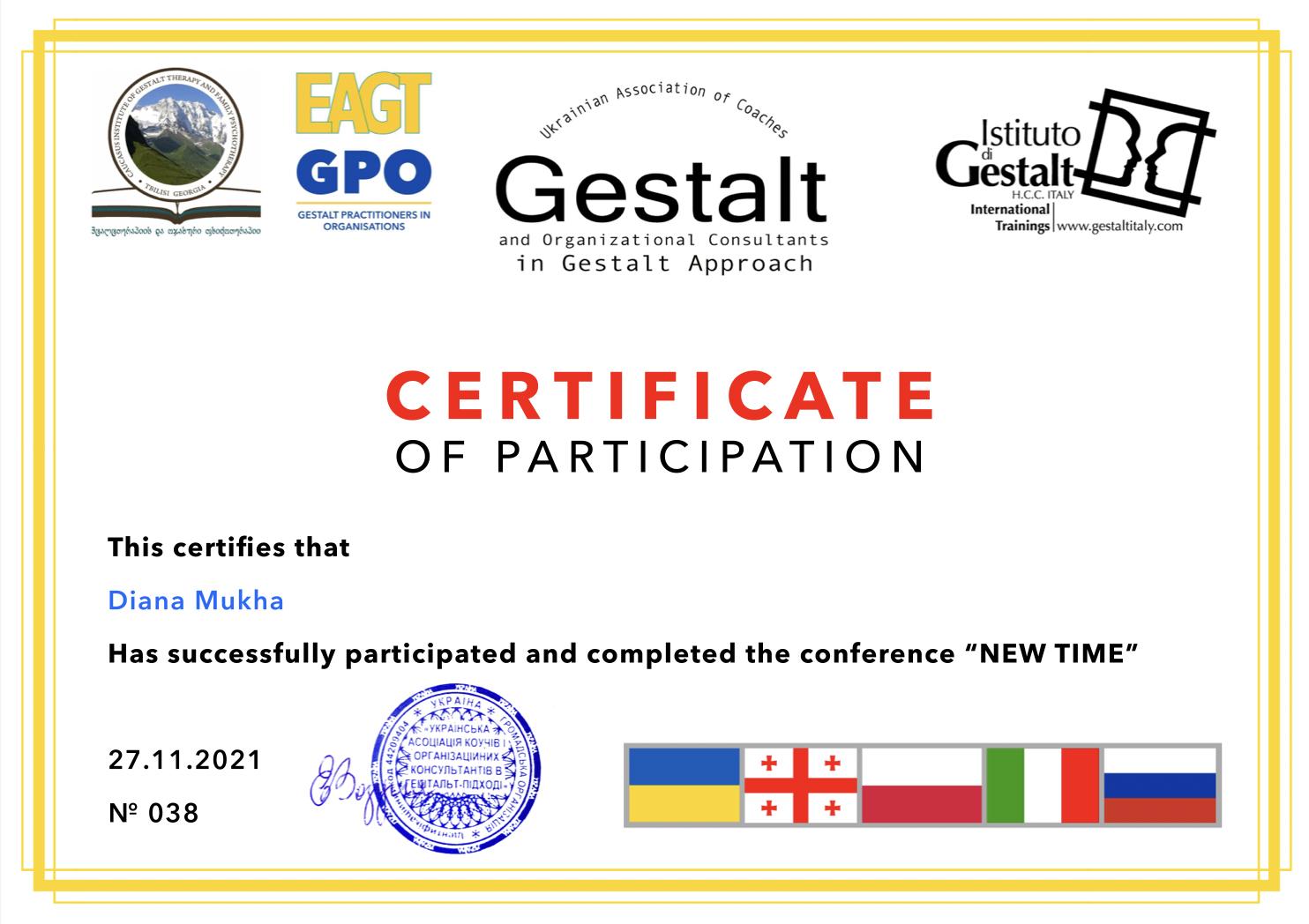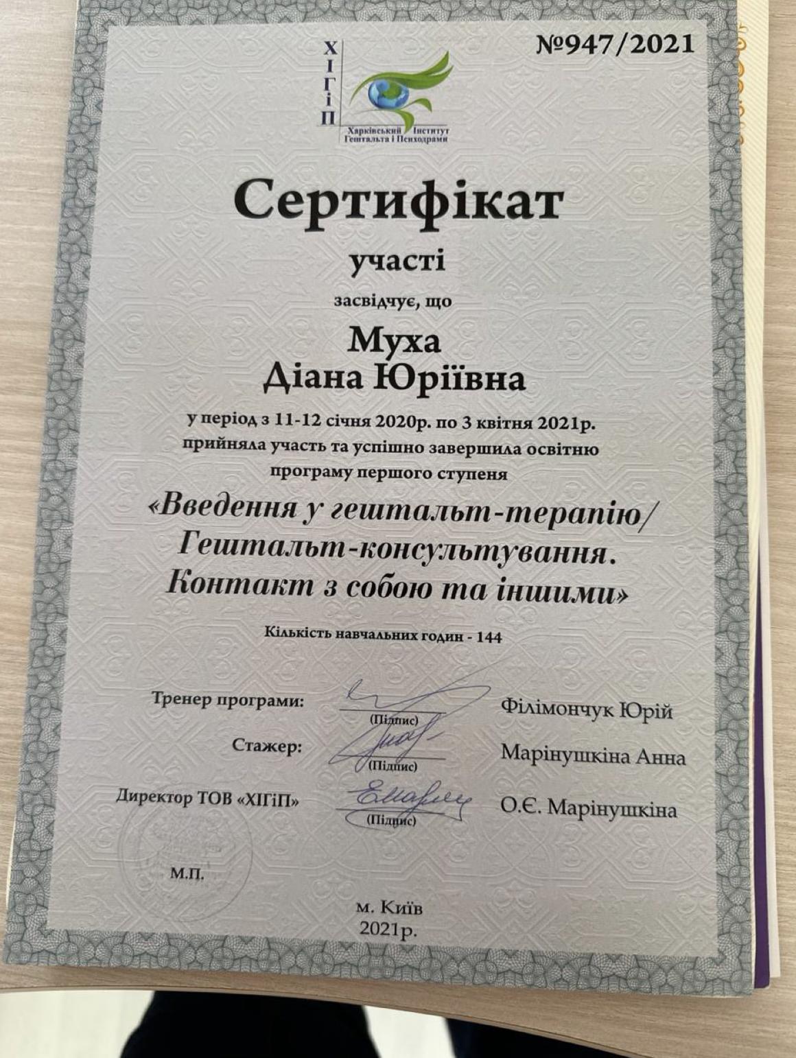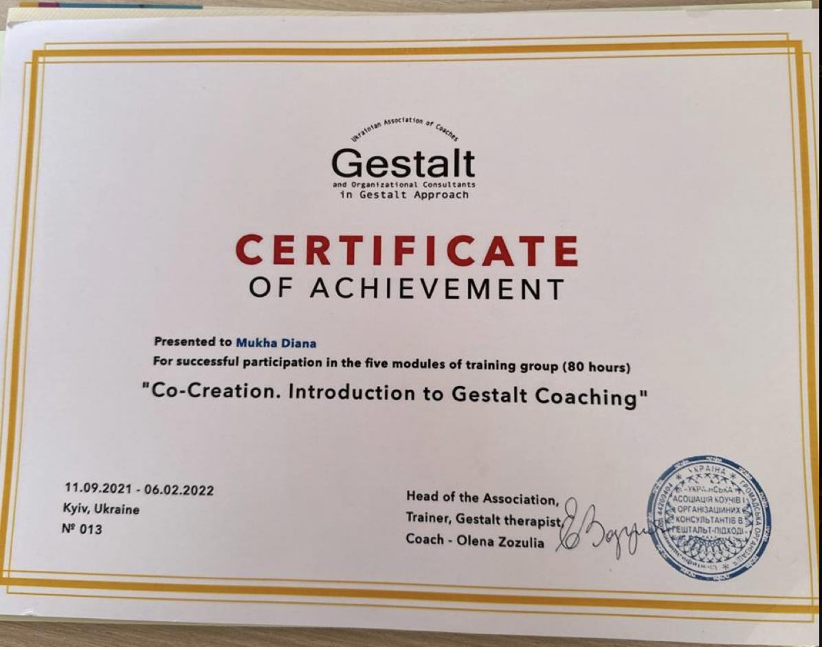 Також я здобула освіту в Українській асоціації коучів та оргконсультантів у гештальт-підході, де навчалася за міжнародними стандартами EAGT GPO.