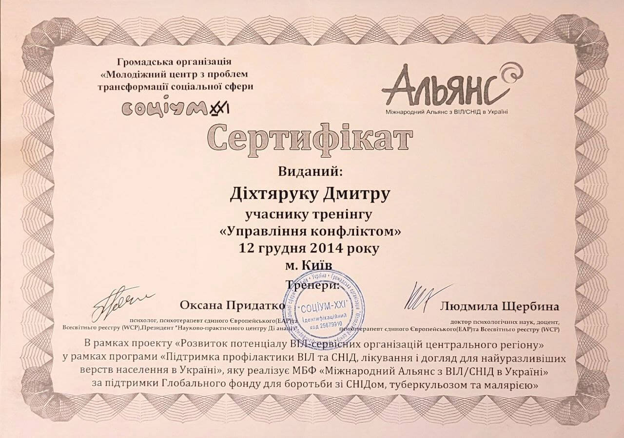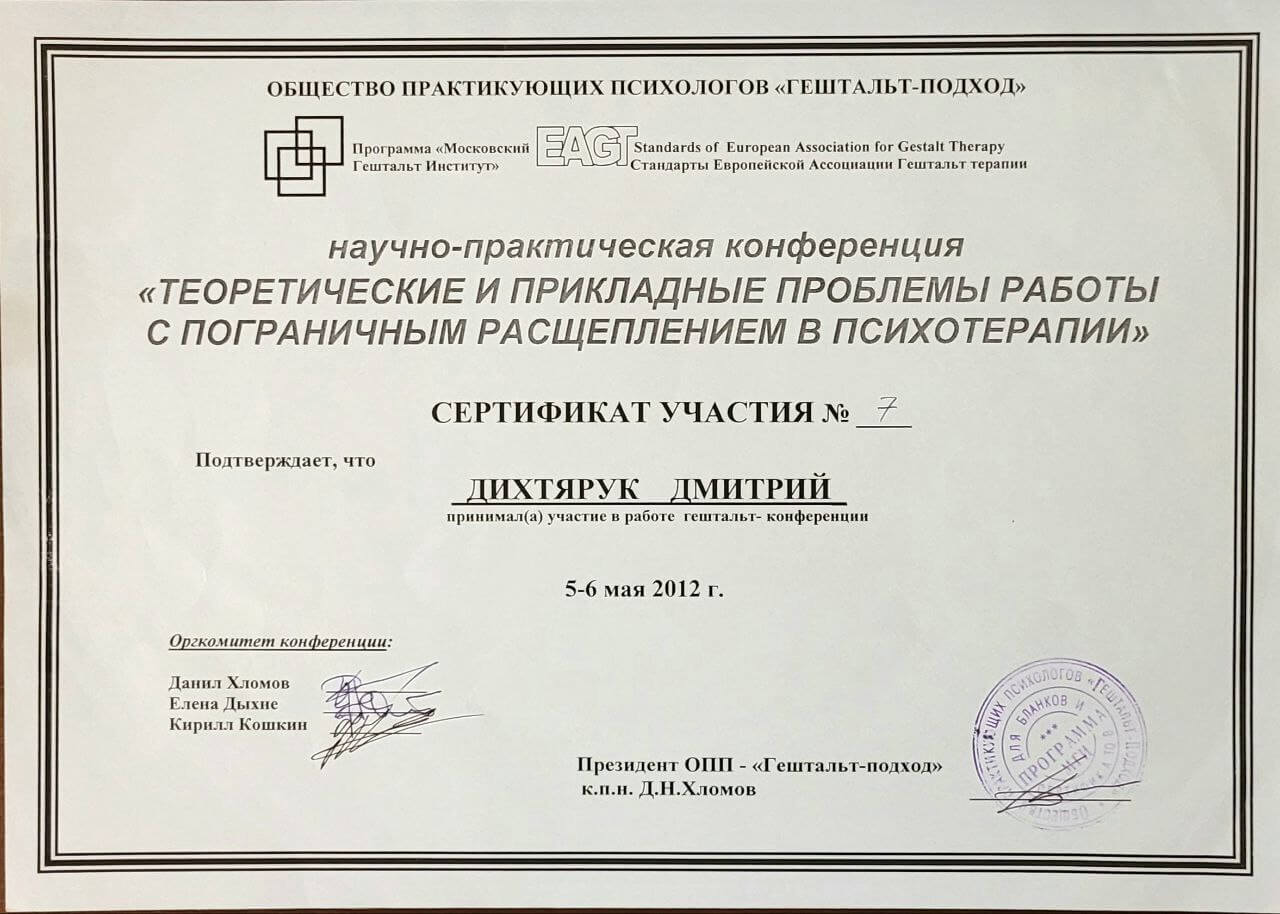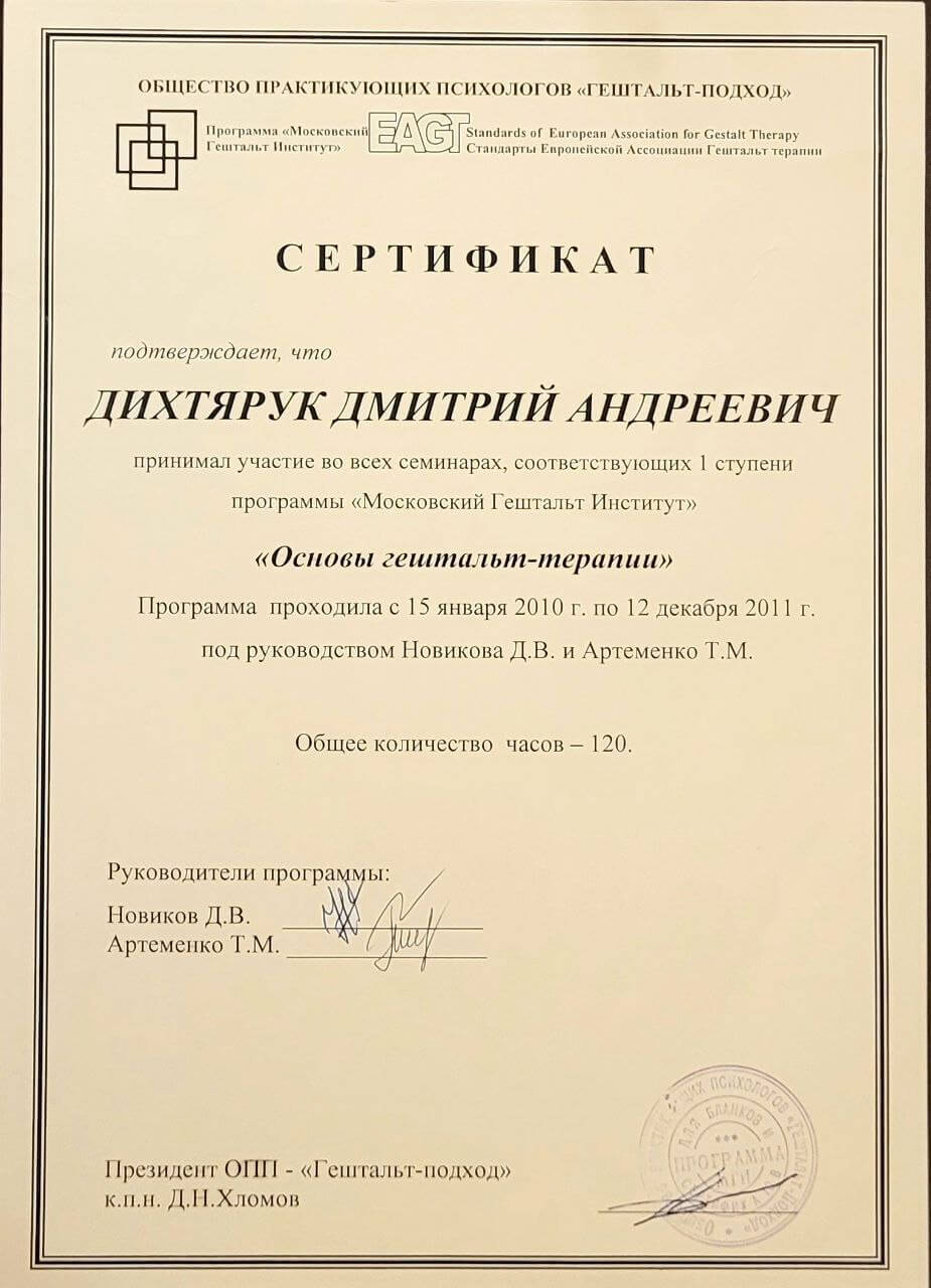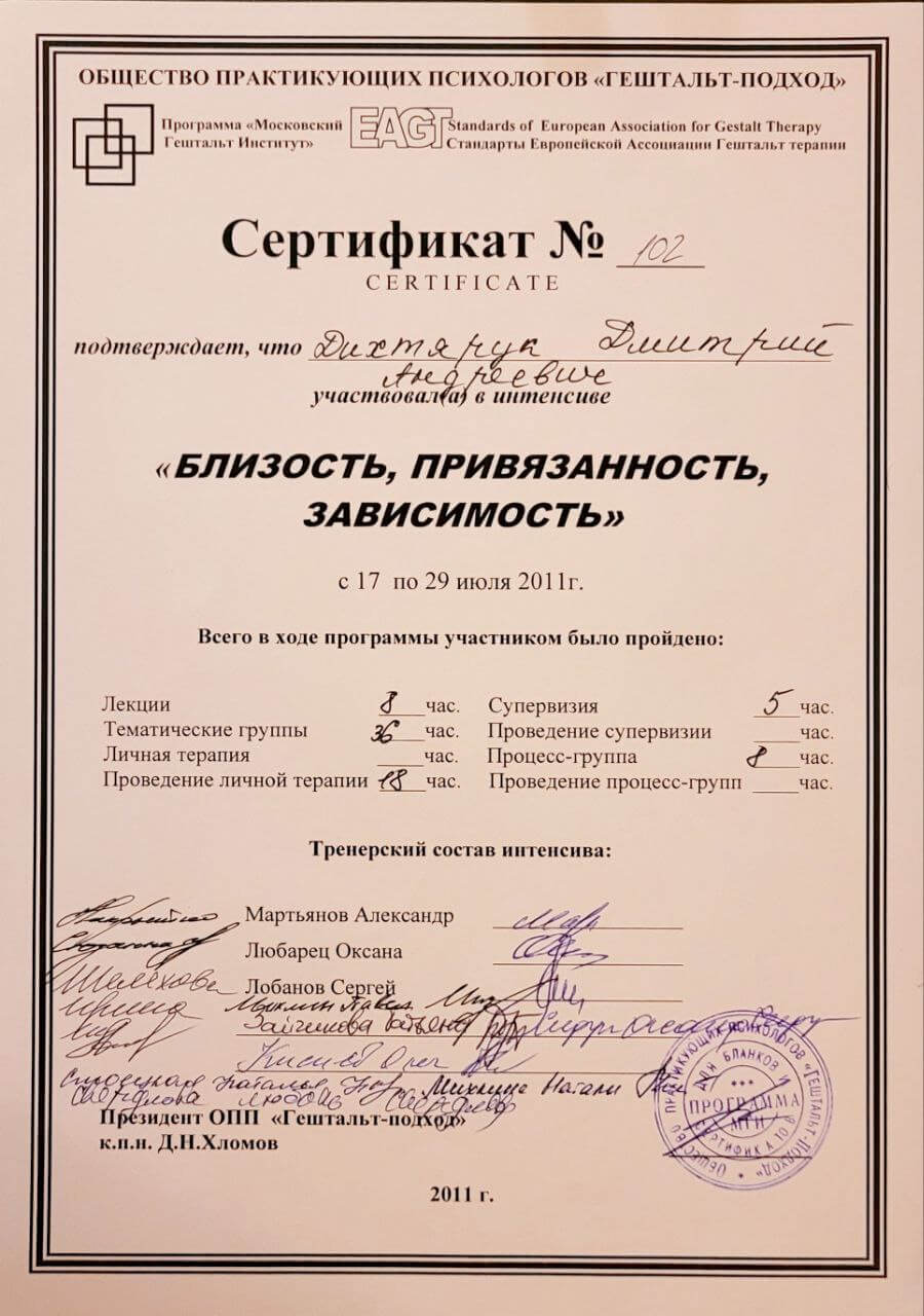 Спеціальність "Гештальт психотерапевт", сертифікований.