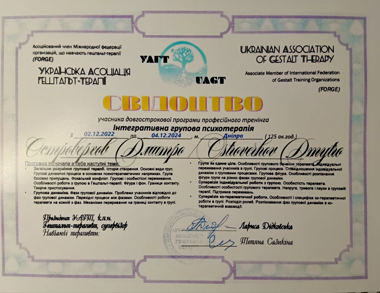 ▪️Навчальна програма "Ведення груп" від члена УАГТ та ЕАГТ - в процесі навчання 2021 - ... р. Групова терапія;