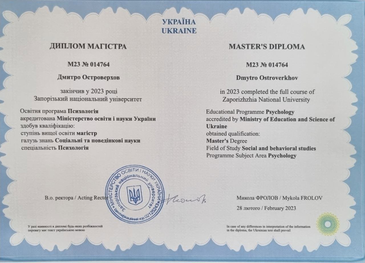 ▪️Запорізький Національний Університет, ЗНУ 2021-2023 р. - ступінь магістр Психології;
