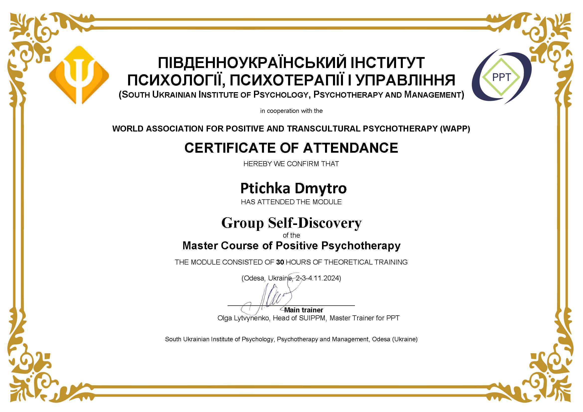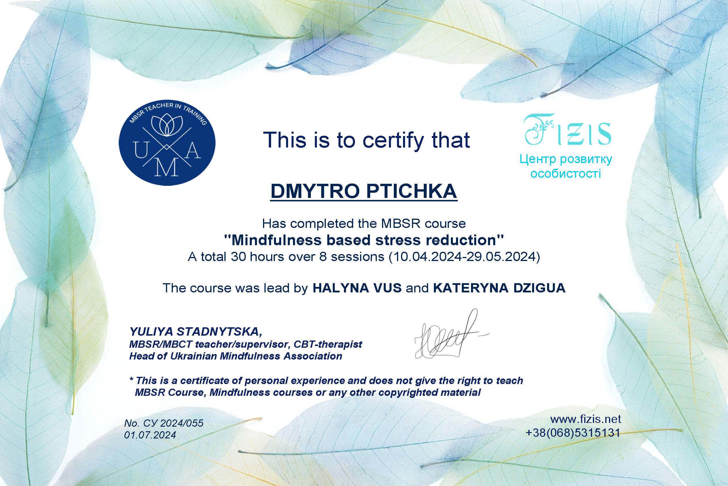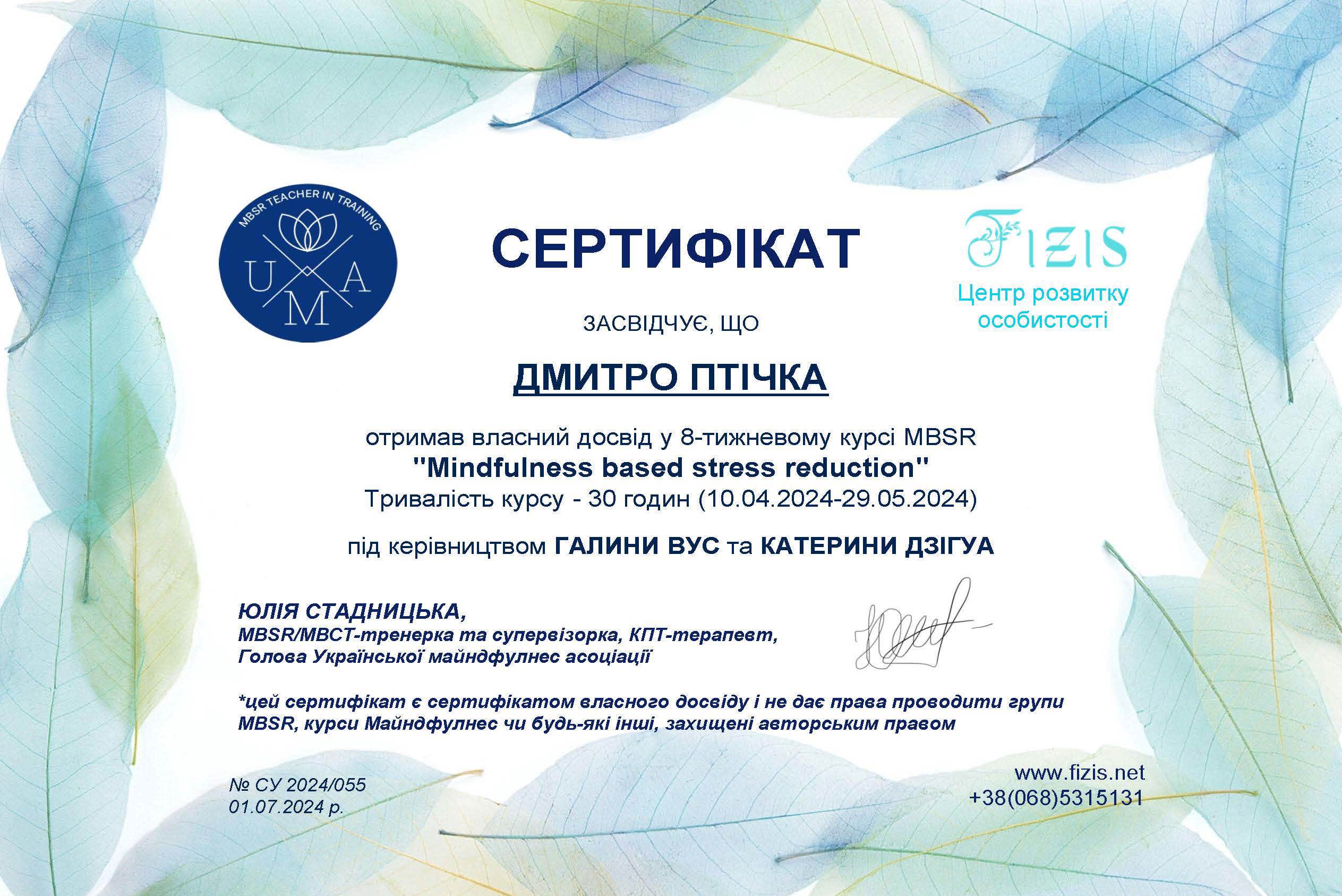 Пройшов річний курс (160 годин) "Пропедевтика психіатричних захворювань" у Львівському психоаналітичному інституті ментального здоров'я, 2024-2025 рр. Отримав власний досвід у 8-тижневому курсі MBSR "Mindfulness based stress reduction". Маю сертифікат. Тривалість курсу - 30 годин (10.04.2024-29.05.2024).