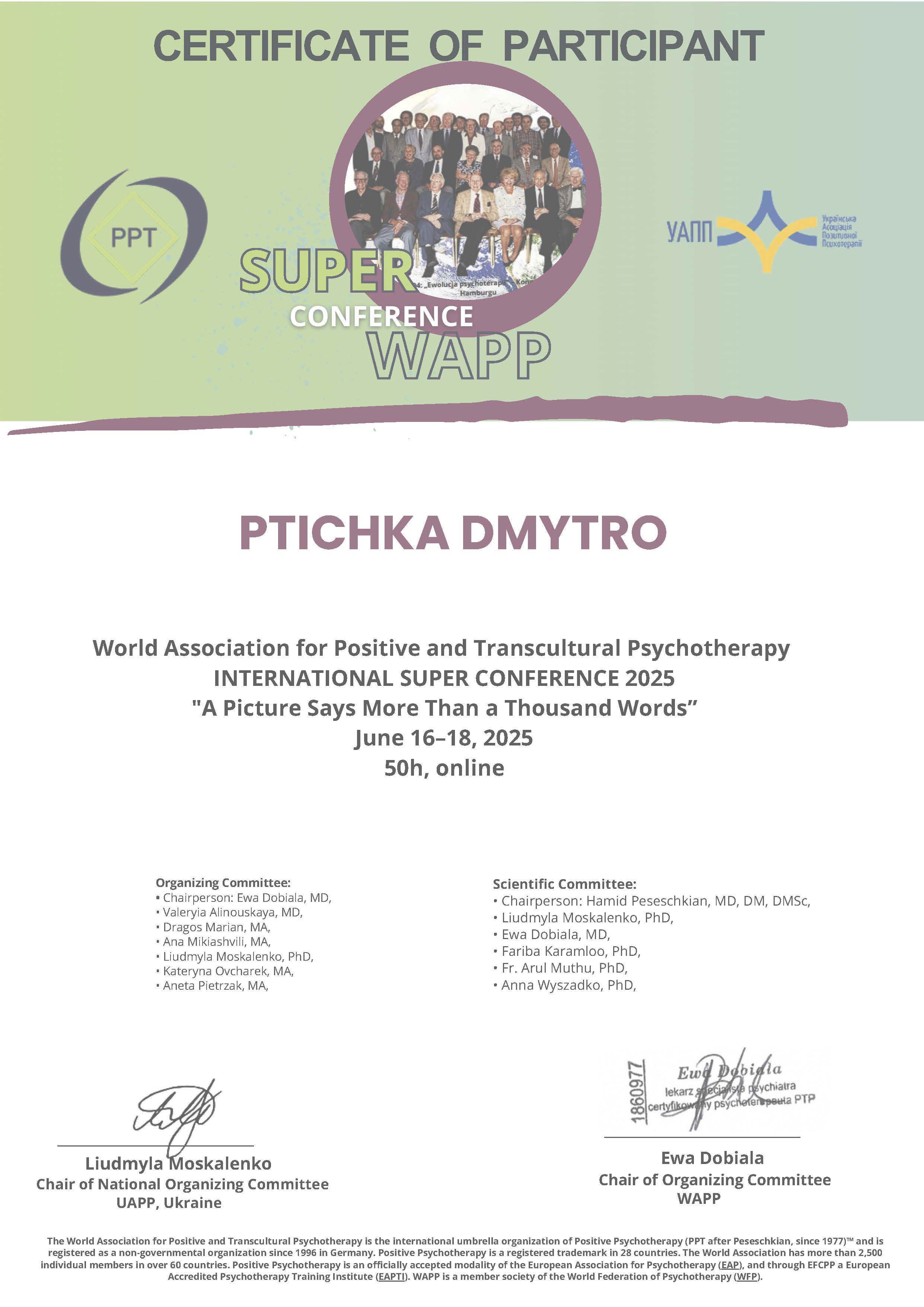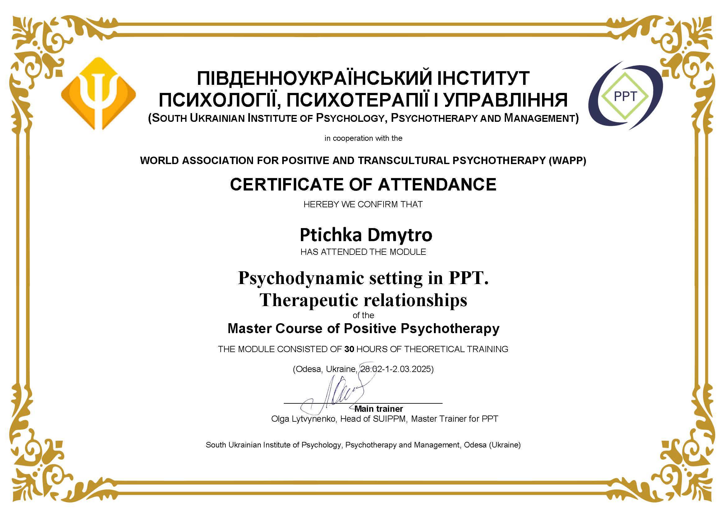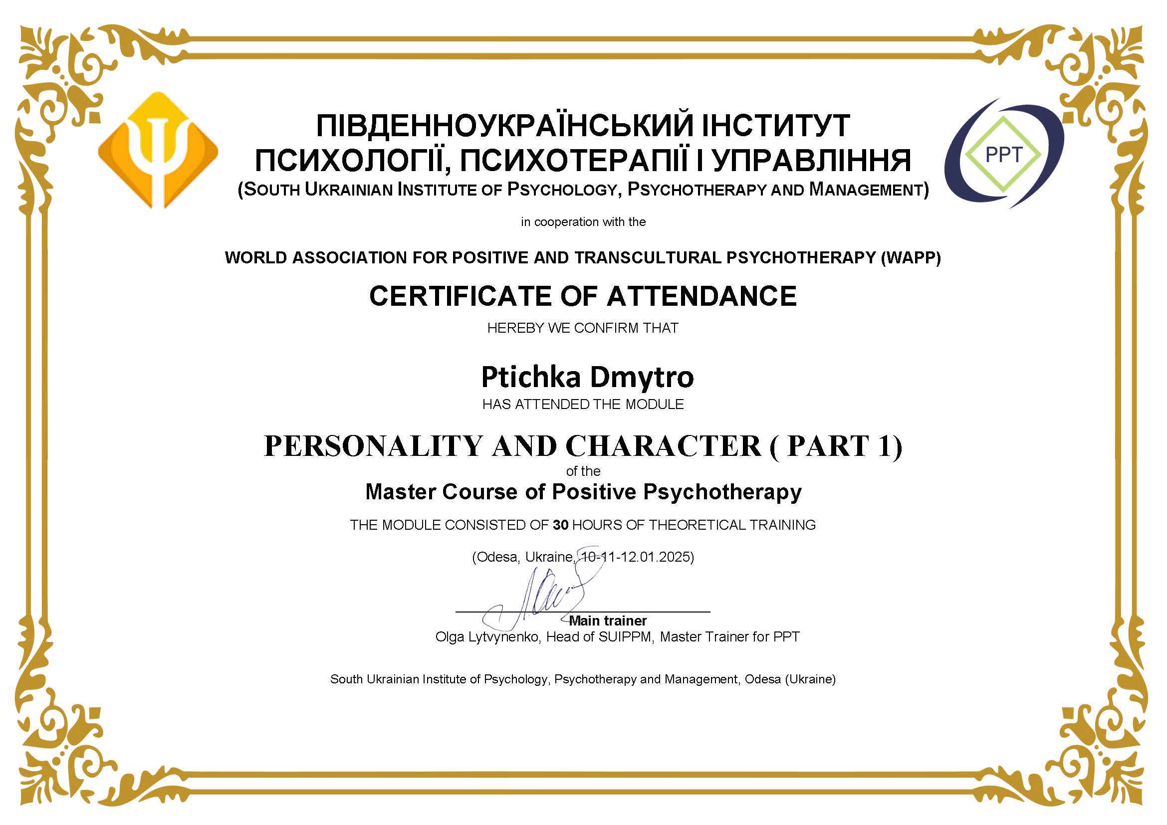 Пройшов річний курс (160 годин) "Пропедевтика психіатричних захворювань" у Львівському психоаналітичному інституті ментального здоров'я, 2024-2025 рр. Отримав власний досвід у 8-тижневому курсі MBSR "Mindfulness based stress reduction". Маю сертифікат. Тривалість курсу - 30 годин (10.04.2024-29.05.2024).
