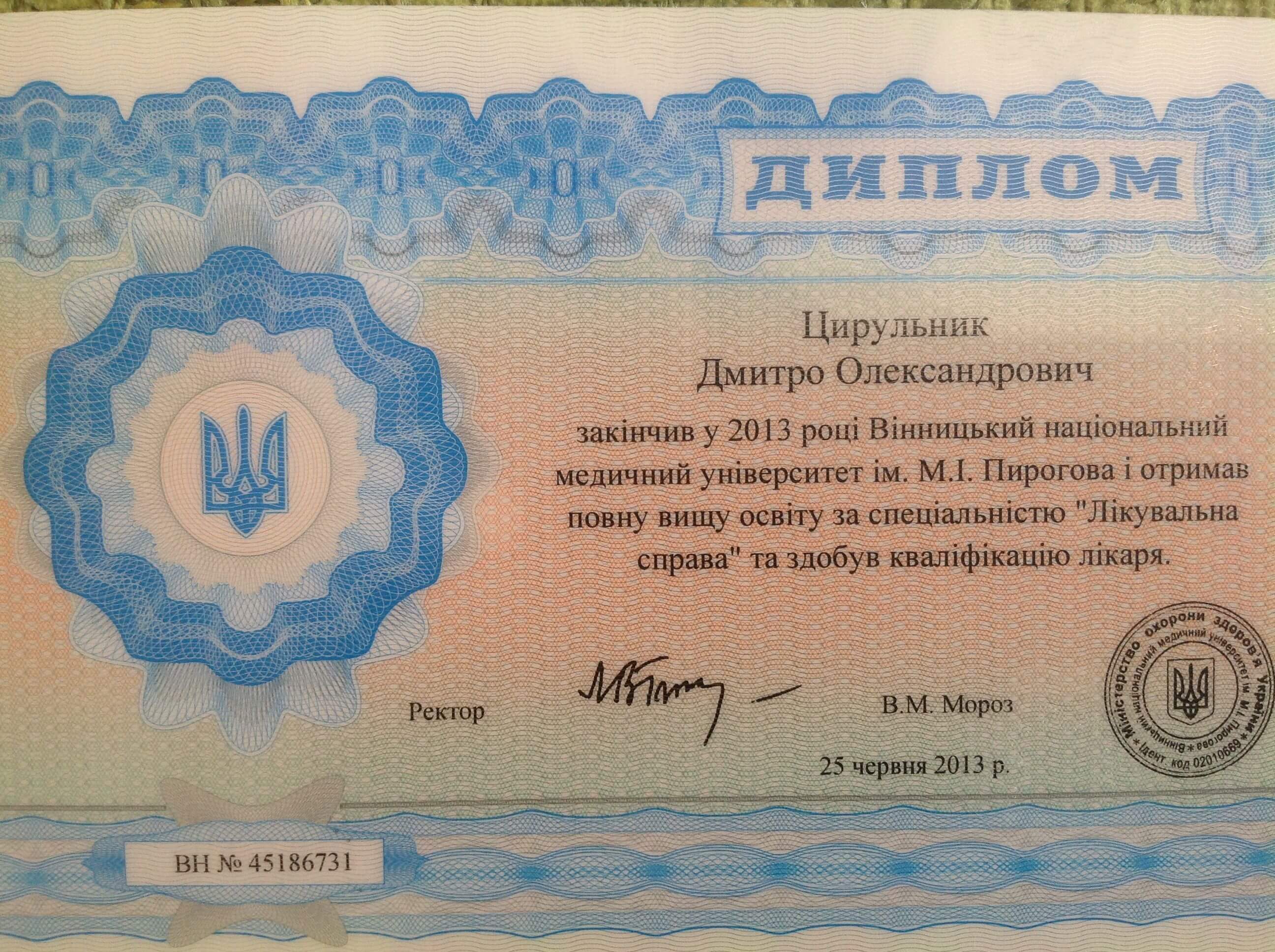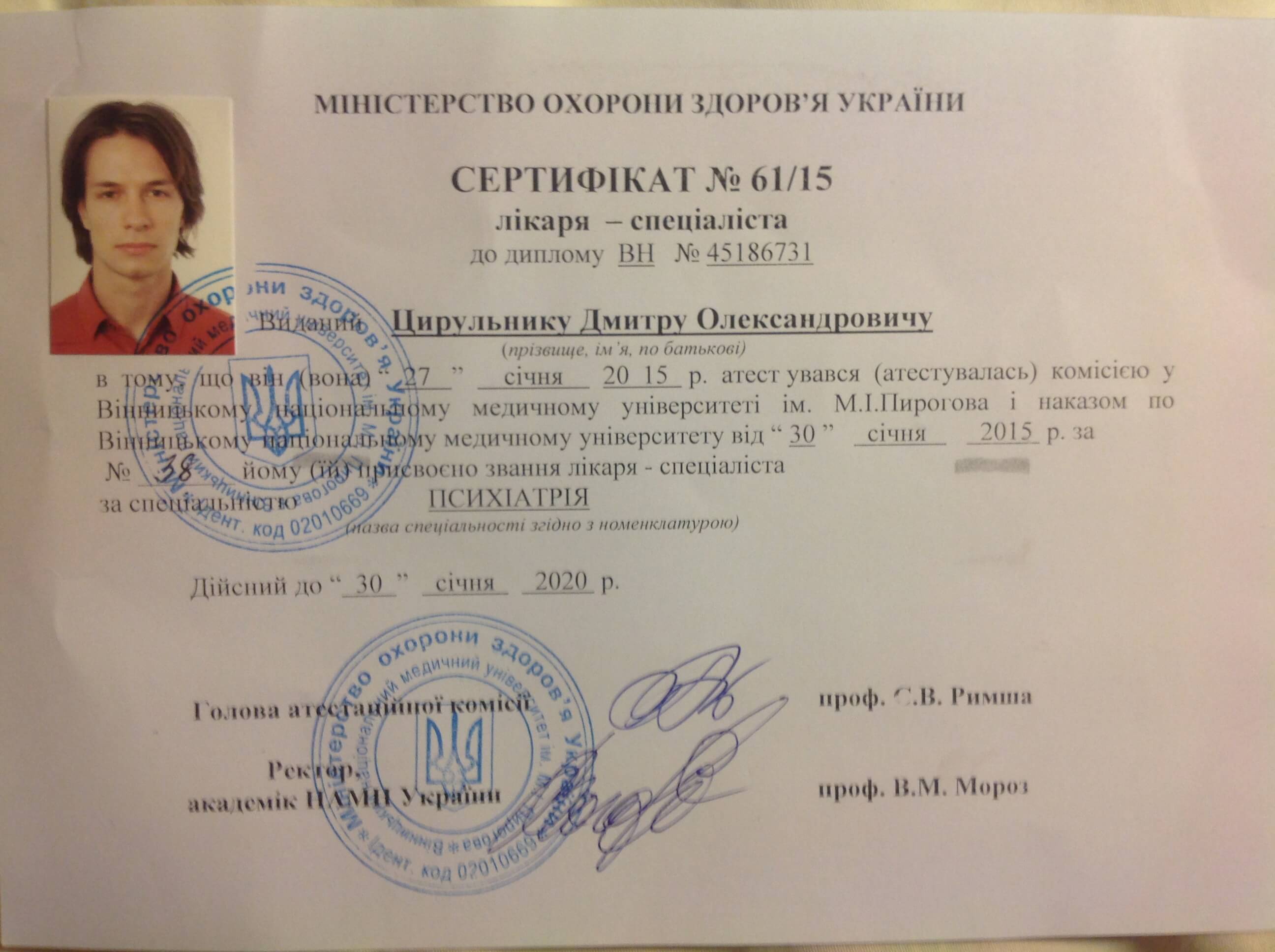 Вінницький медичний університет ім М. І. Пирогова. Лікар-психіатр. Закінчив інтернатуру і ординатуру по психіатріі.