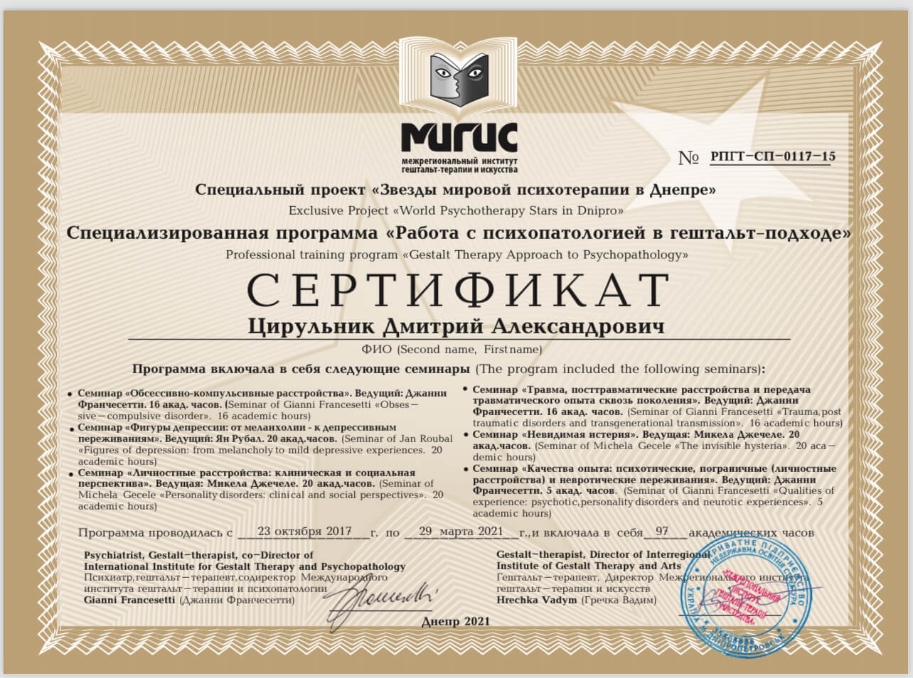 Сертифікований гештальт терапевт - інститут МІГІС.
