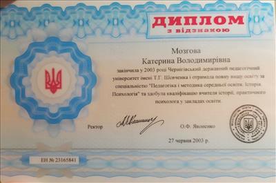 Вища психологічна освіта – у 2003 році закінчила Чернігівський педагогічний університет ім. Т.Шевченка.