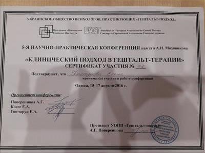Закінчила Бердянський державний педагогічний інститут, закінчила 2 ступені Московського гештальт інституту, зараз навчаюсь на 3 ступені, спеціалізації: клінічна, кризи і травми, перебуваю зараз на поглибленому вивченні психіатрії, сертифікована в розстановках по Хеленгеру, сертифікована , закінчила курс з антистресової кінезіології, , регулярно беру участь у конференціях, круглих столах, присвячених психотерапії в гештальт підході.