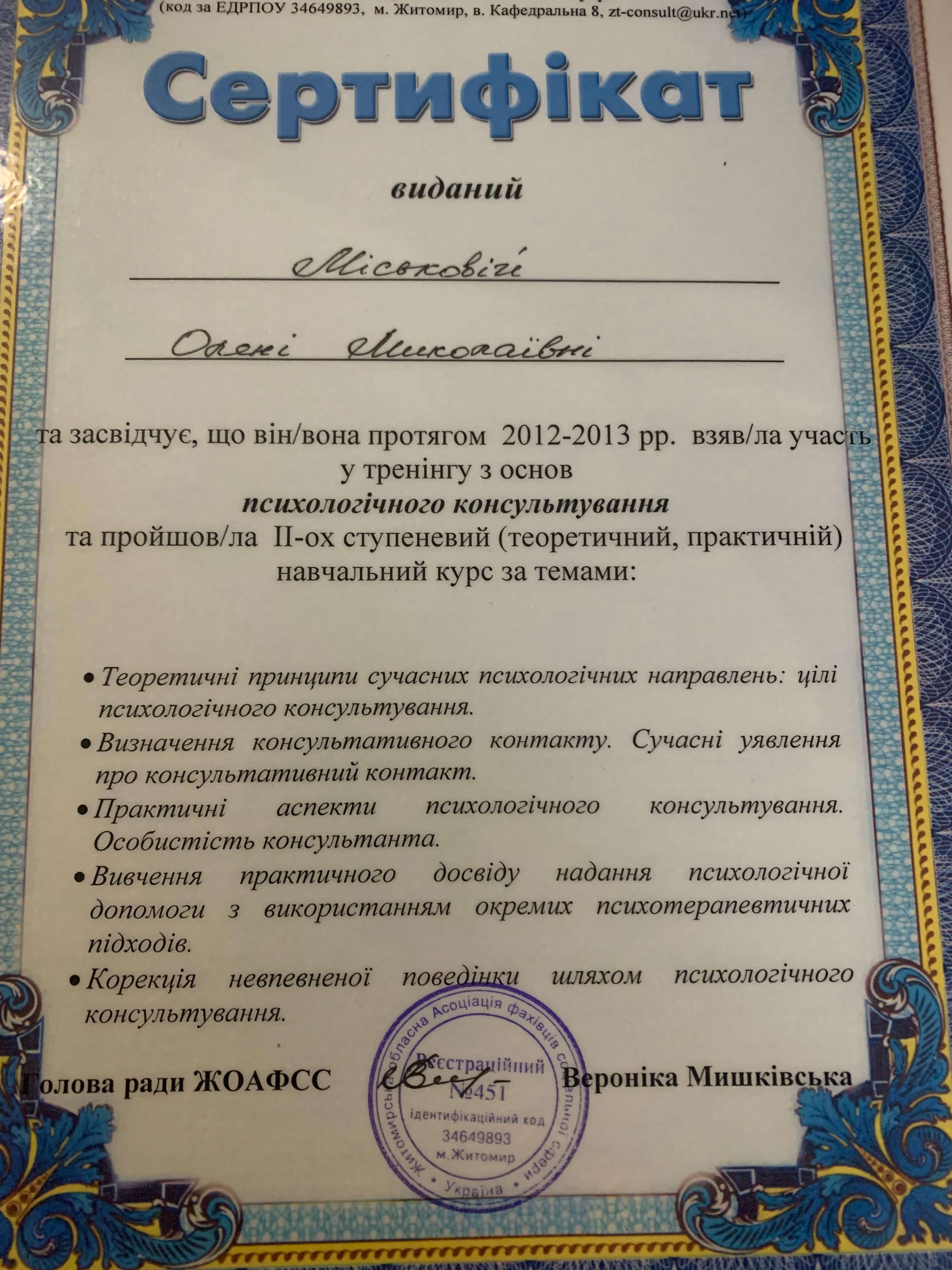 Закінчила університет імені Івана Франка, навчаюсь на психотерапевта за методом символдраму, закінчила перший ступінь гештальт терапії, шокові травми та ПТСР.