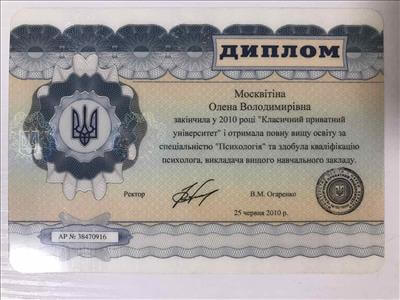 У 2010 році - диплом "Магістр психології", пройшла навчання та отримала сертифікацію за такими напрямками: