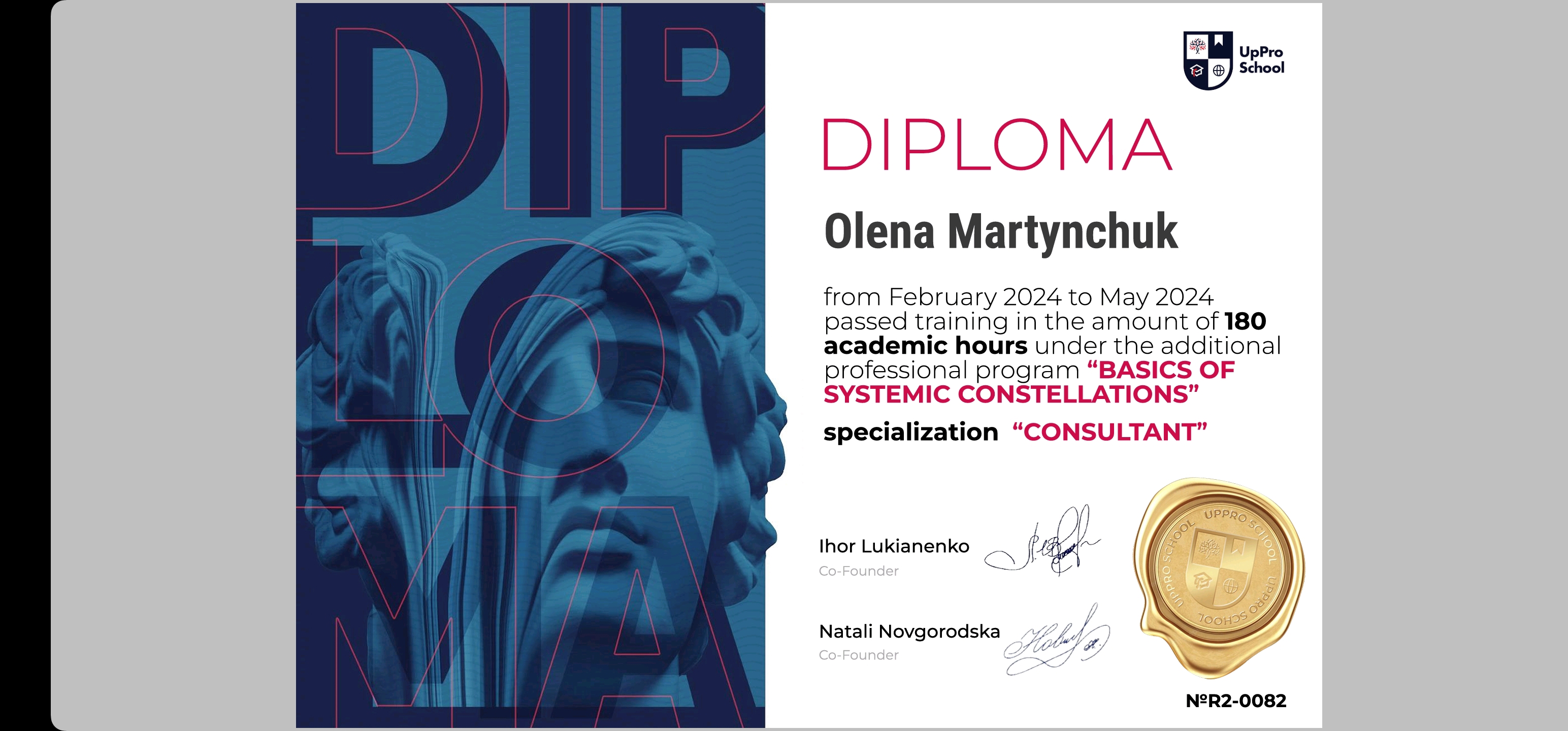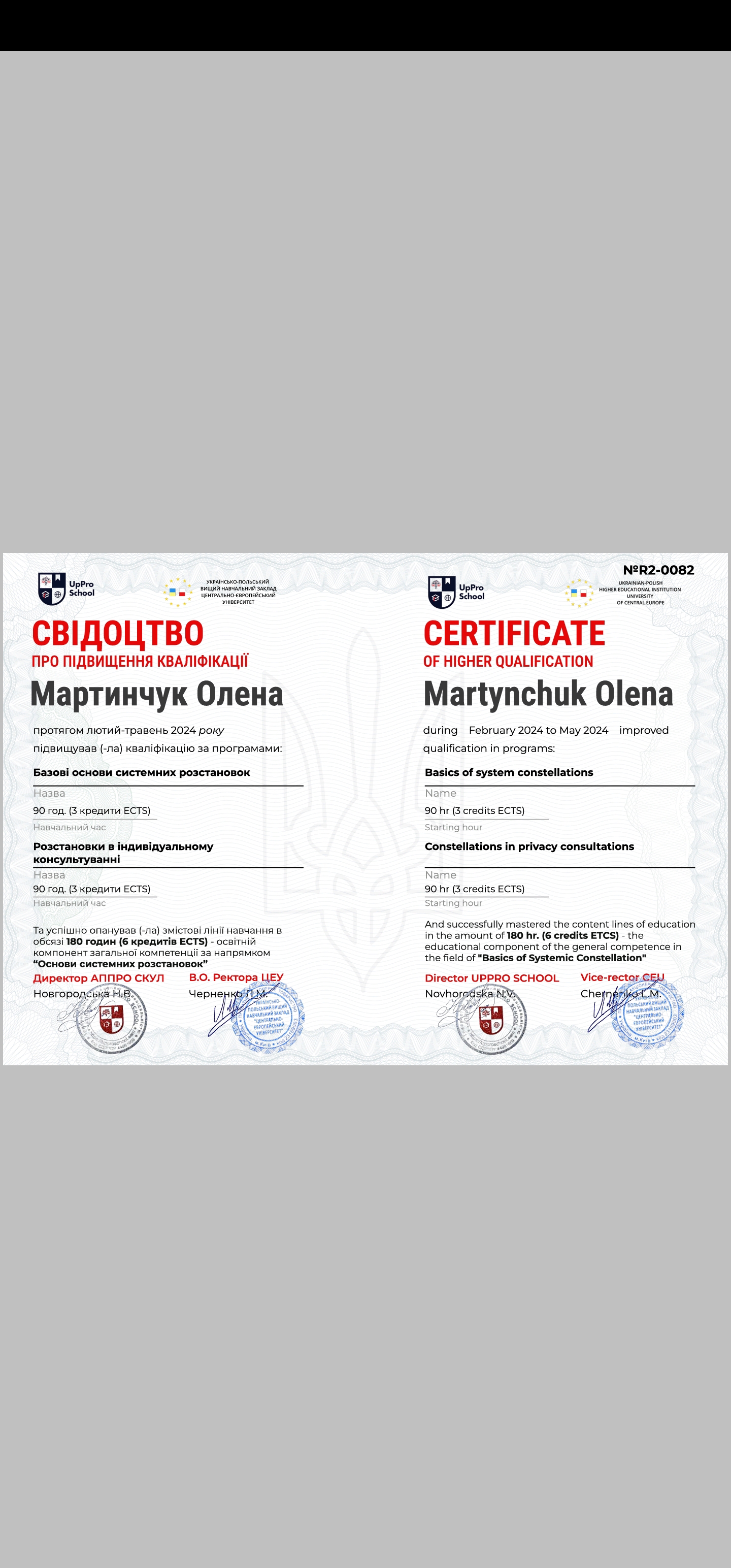 Люблю свою роботу, постійно проходжу навчання, супервізії та особисту терапію. Маю емпатію і тактисність, дбайливо ставлюся до почуттів інших.