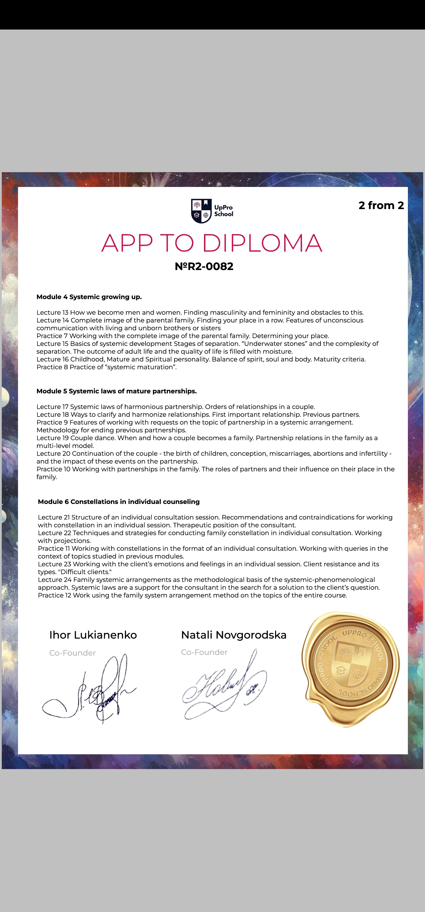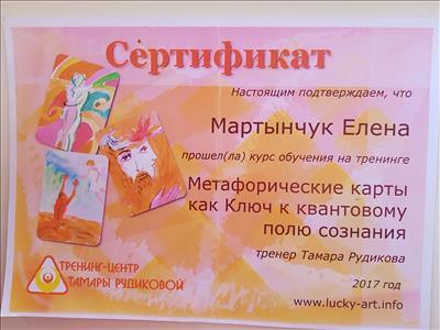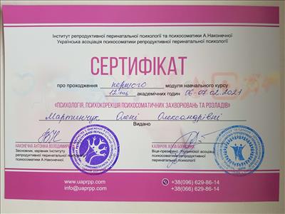 Дипломований, практикуючий психолог, сексолог, сертифікований процесор RPT-Rapid Personal Transformation (Швидкі Особистісні Зміни). Працюю із запитами щодо психосоматики, у тому числі з репродуктивною сферою.