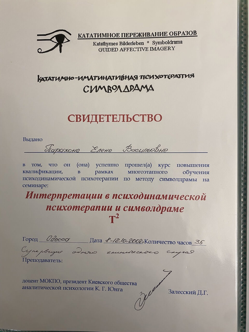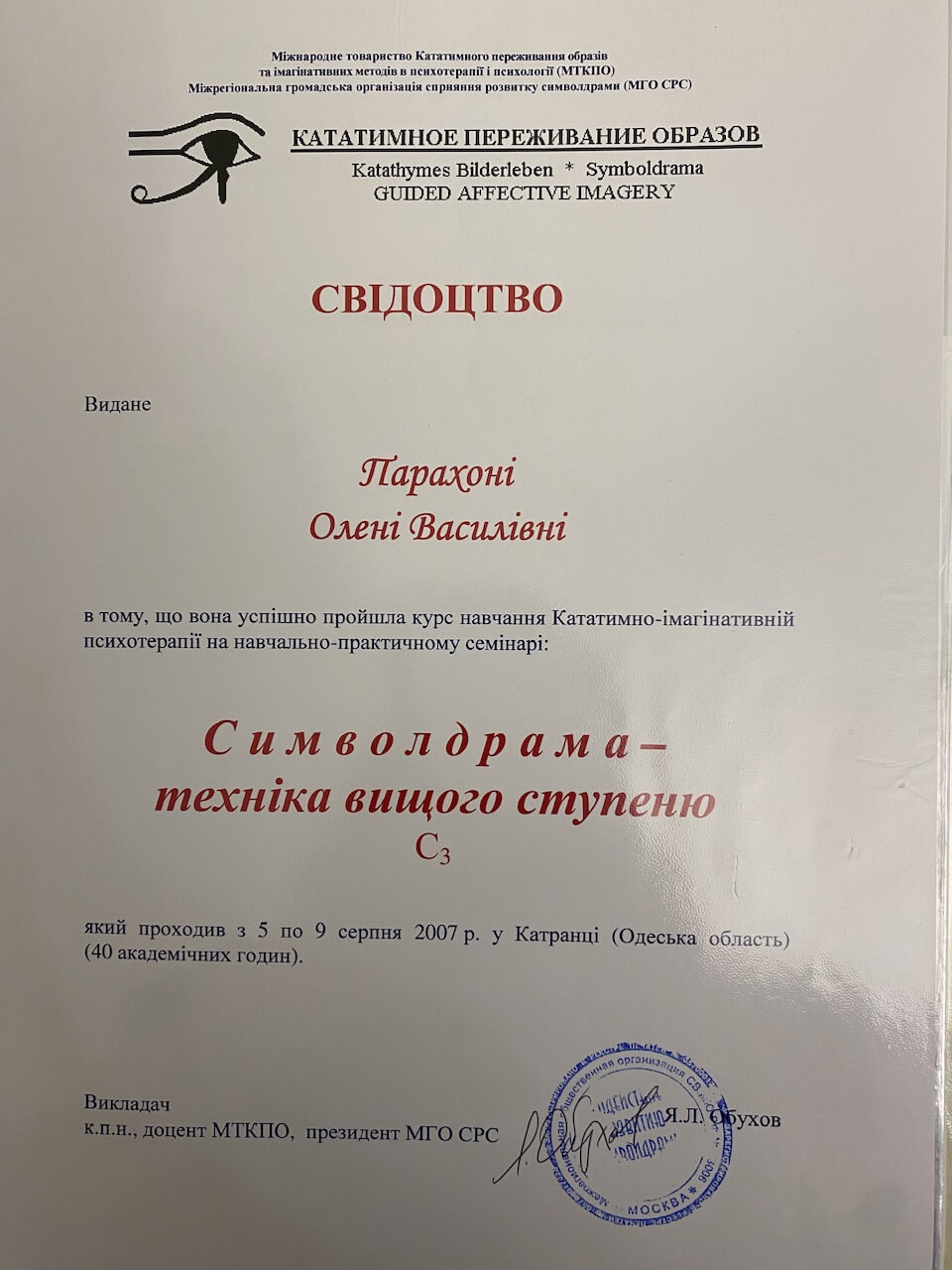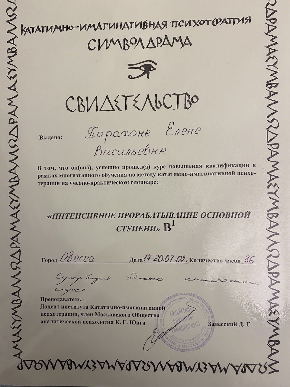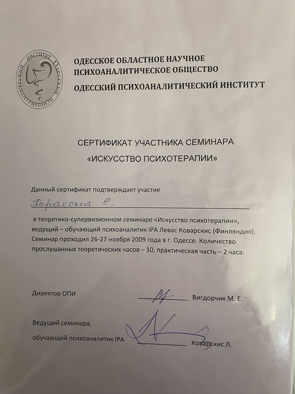 Також проходила курси підвищення кваліфікації при присвоєнні кваліфікації – психолог першої категорії від міністерства освіти, потім вищої категорії від МОЗ