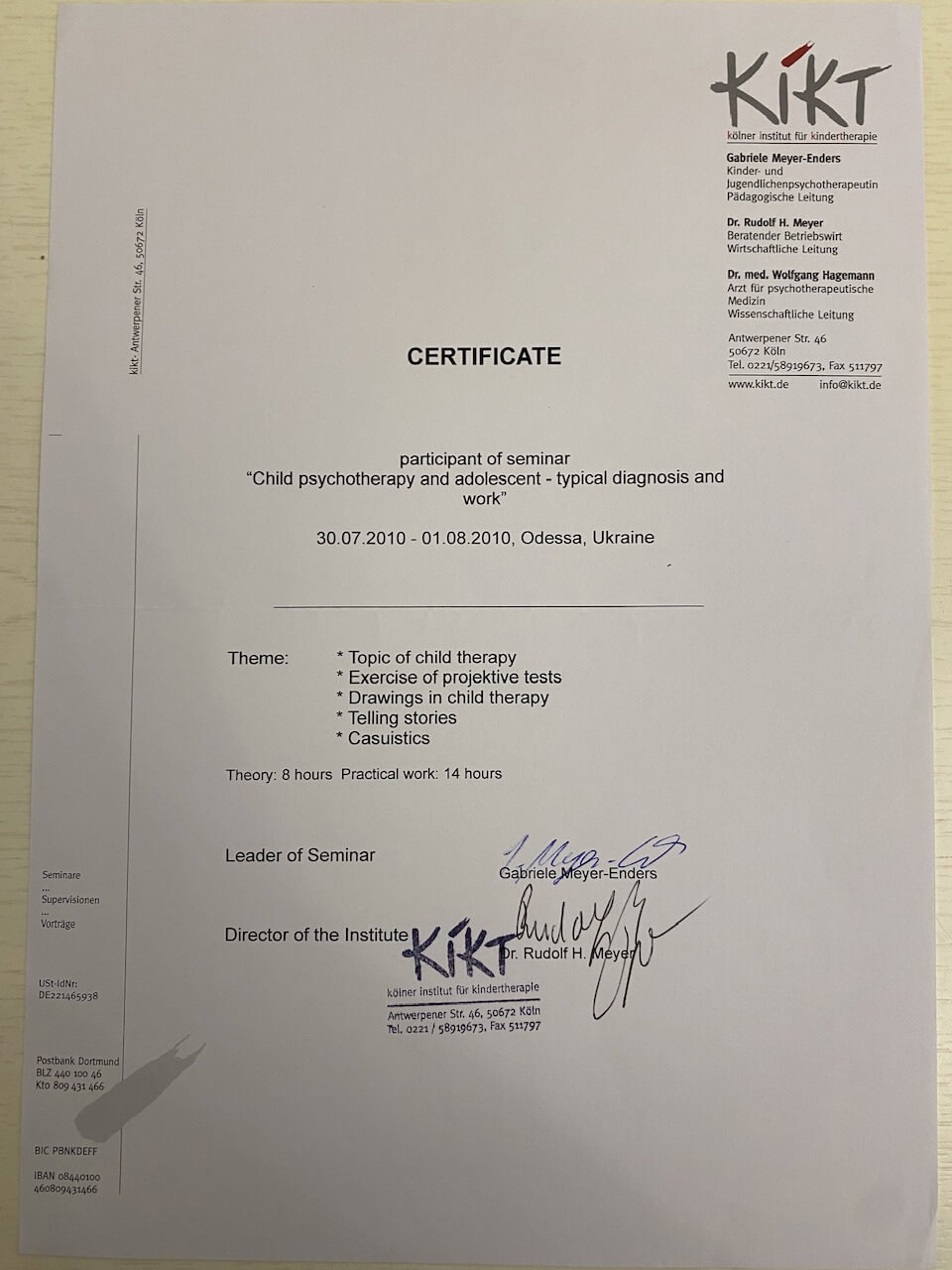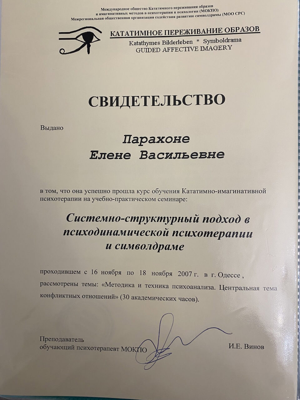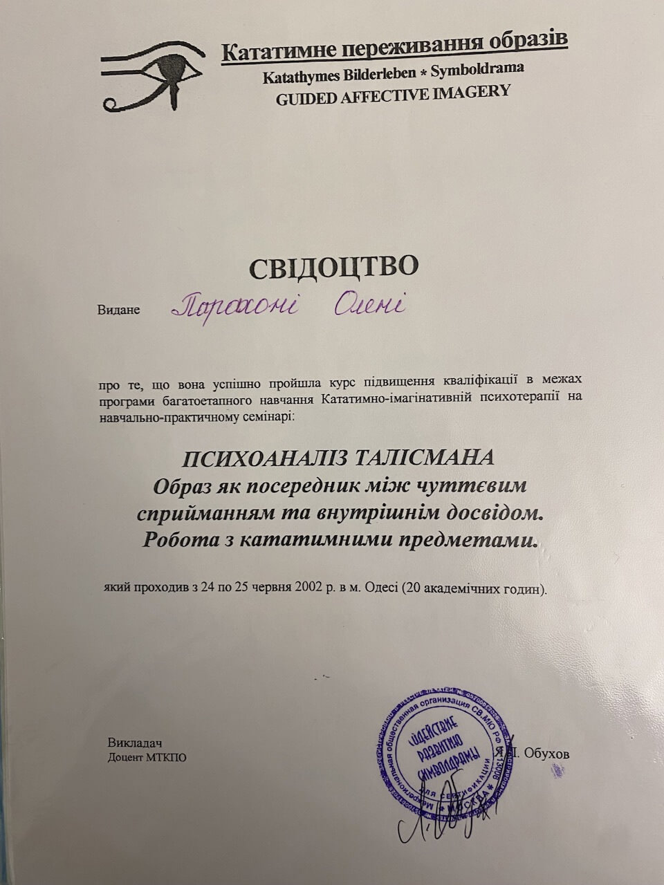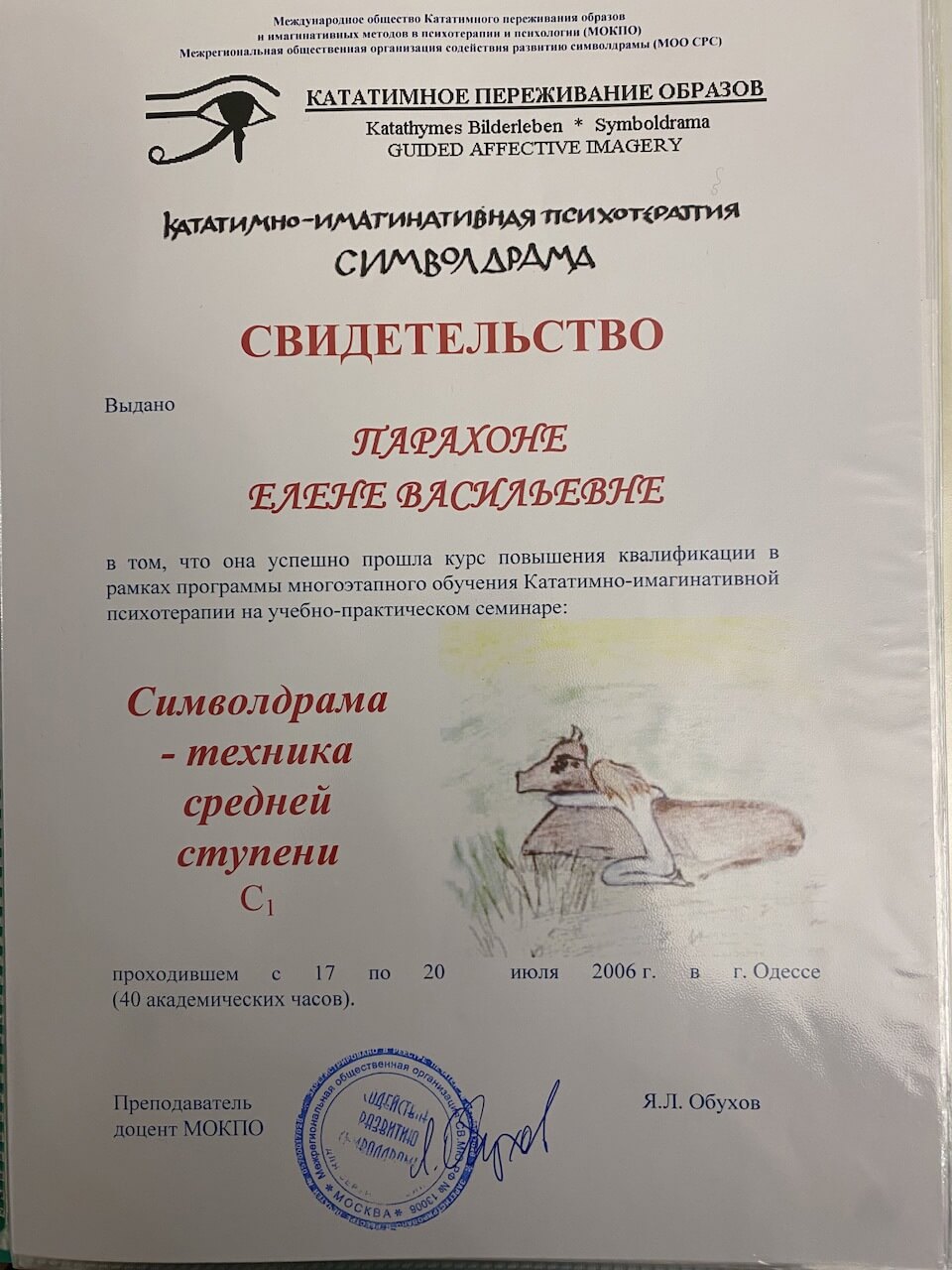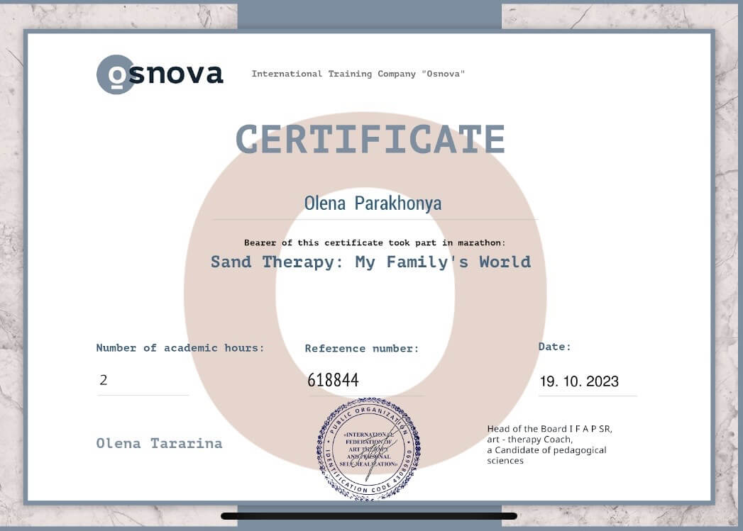 Також проходила курси підвищення кваліфікації при присвоєнні кваліфікації – психолог першої категорії від міністерства освіти, потім вищої категорії від МОЗ