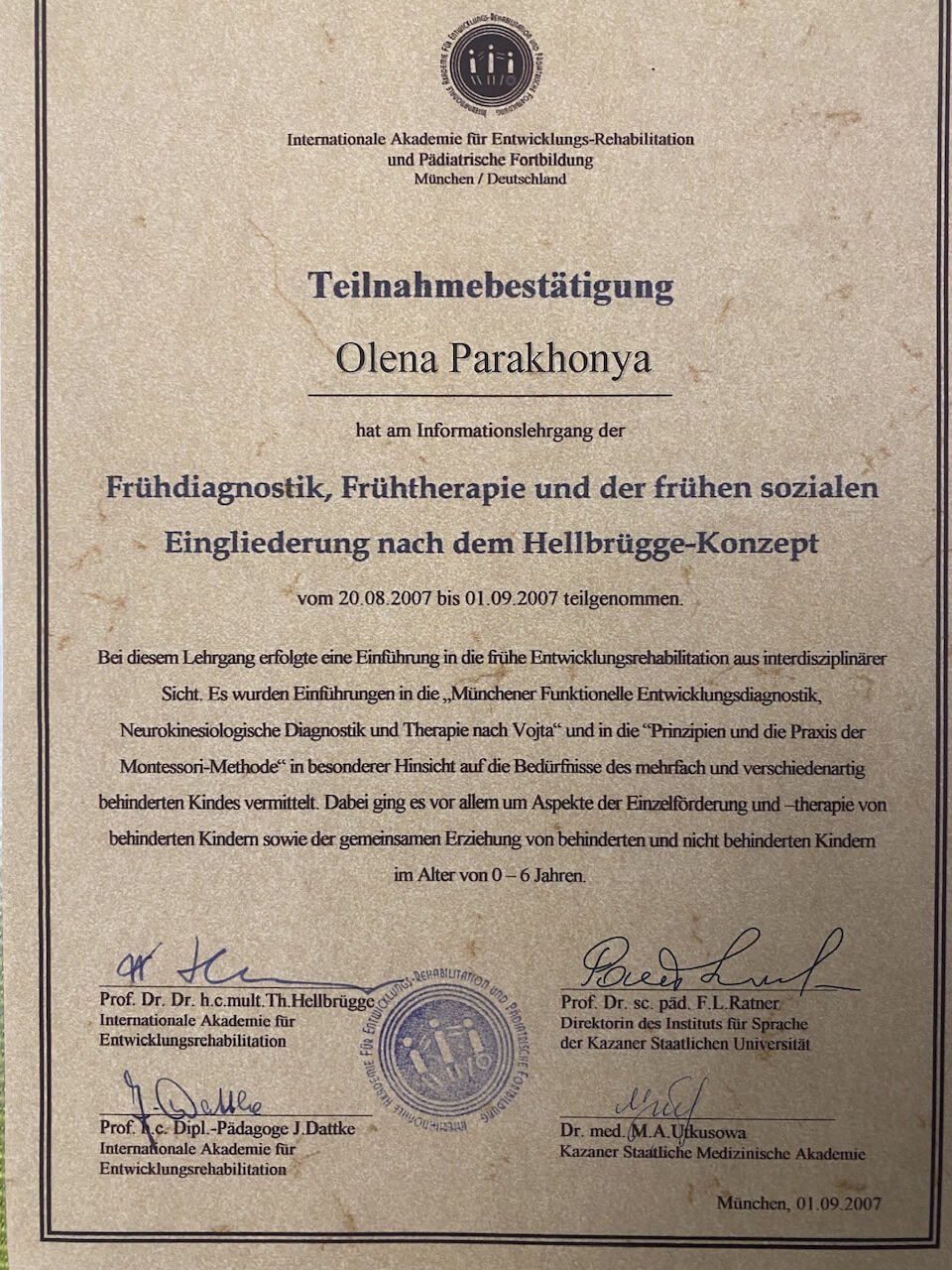 Монтессорі терапія та педагогіка на базі Мюнхенської академії реабілітації розвитку;