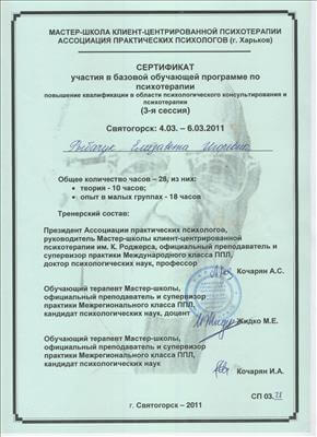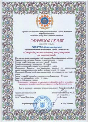 Вітаю. Мені 44 роки. Як фахівець – люблю свою професійну діяльність, постійно підвищую рівень знань, освоюю нові напрямки та техніки у практичній роботі. З 2012р. є членом ВОППГП.