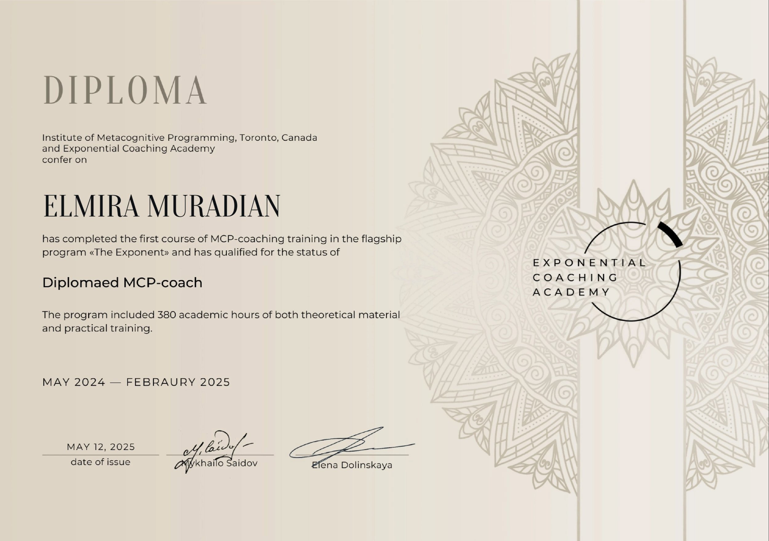 Дипломированный Экспоненциальный коуч ( Академия Экспоненциального коучинга Михаила Саидова)