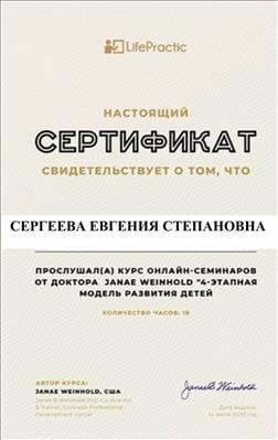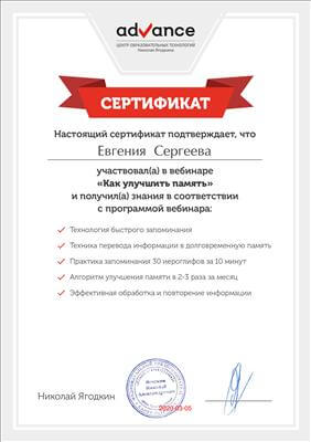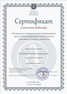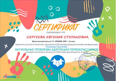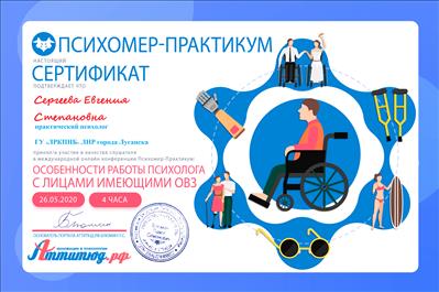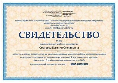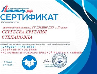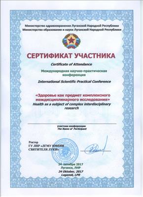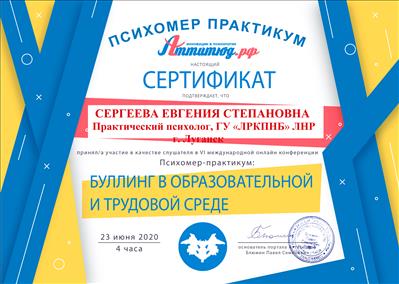 1. Пройшла курси з циклу тематичного вдосконалення «Вибрані питання медичної психології» на базі ГУ «Луганського державного медичного університету», факультет післядипломної освіти ЛНР.