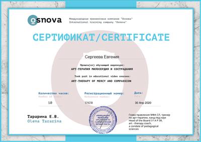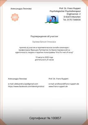 9. Пройшла курс підвищення кваліфікації в рамках програми багатоетапного навчання Кататимно-імагінативної психотерапії на навчально-практичному семінарі: «Вступ до основ Символдрами» А1.