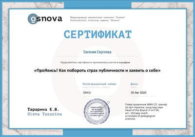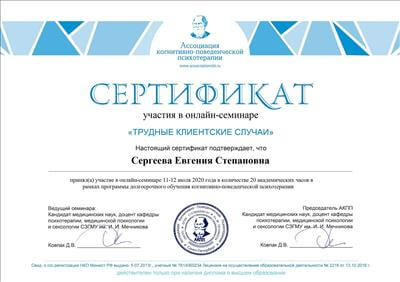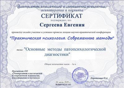 1. Пройшла курс підвищення кваліфікації в рамках програми багатоетапного навчання Кататимно-імагінативної психотерапії на навчально-практичному семінарі: «Психодіагностика з OPD: загальне уявлення та докладно осі I, II, III, IV» Т4 Частина II.