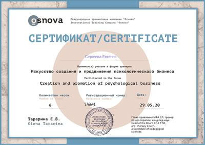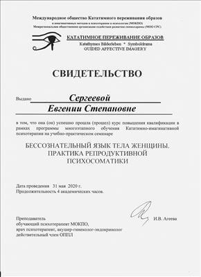 6. Пройшла курс підвищення кваліфікації у рамках програми багатоетапного навчання Кататимно-імагінативної психотерапії на навчально-практичному семінарі: «Неврози. Психосоматичні захворювання. Клінічні та психоаналітичні аспекти».