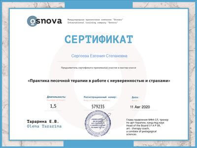 2. Пройшла курс підвищення кваліфікації в рамках програми багатоетапного навчання Кататимно-імагінативної психотерапії на навчально-практичному семінарі: «Символдрама – поглиблене опрацювання основного ступеня» В1.