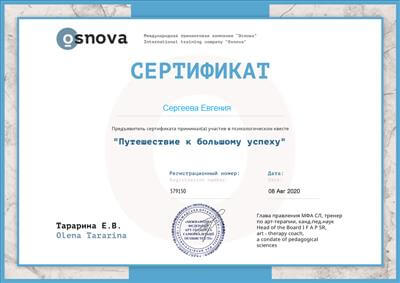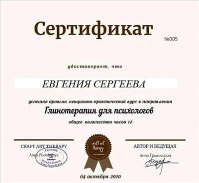 1. Пройшла курс підвищення кваліфікації в рамках програми багатоетапного навчання Кататимно-імагінативної психотерапії на навчально-практичному семінарі: «Вступ до клінічної та психоаналітичної діагностики та практики» Т1.
