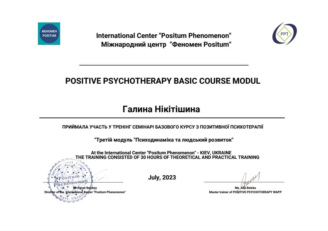 Психотерапія для мене стала своєрідним компасом у подорожі в глибини своєї душі та розвитку свого інтелектуального та емоційного росту. Цей шлях, який розпочався із пошуку відповідей на питання, пов'язані із моєю психічною та емоційною стабільністю, обернувся для мене найважливішою подорожжю у моєму житті.