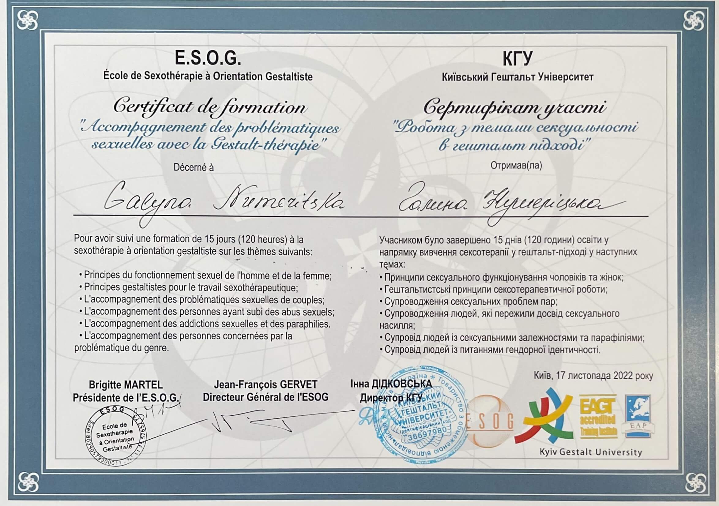 Київський Гештальт Університет - завершив 2 щабель (з 2017 р. по 2021 р.)