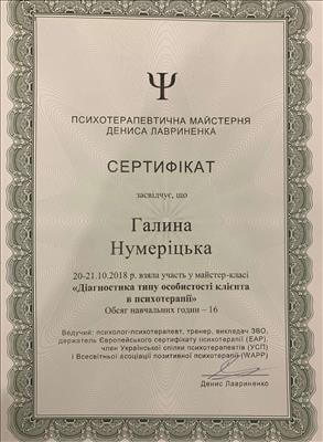 Дуже люблю свою роботу і прагну постійно зростати та розвиватися професійно. Досвід особистої та групової терапії – з 2013 року. Як терапевт я дбайлива, стійка та уважна. Одружена, є дитина.