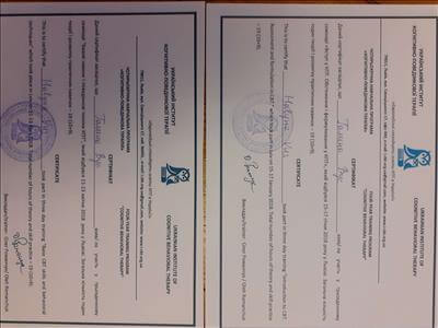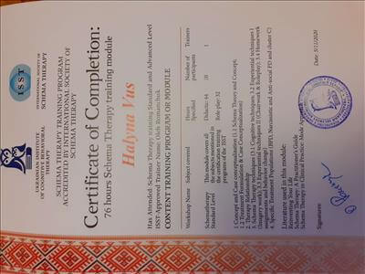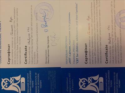 2018-2019 рр. – завершила річну спеціалізовану навчальну програму «КПТ із дітьми, молоддю та їх рідними».