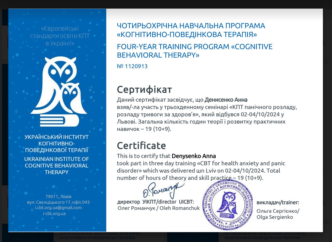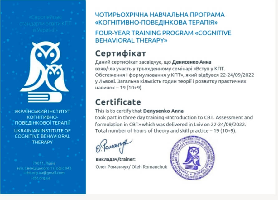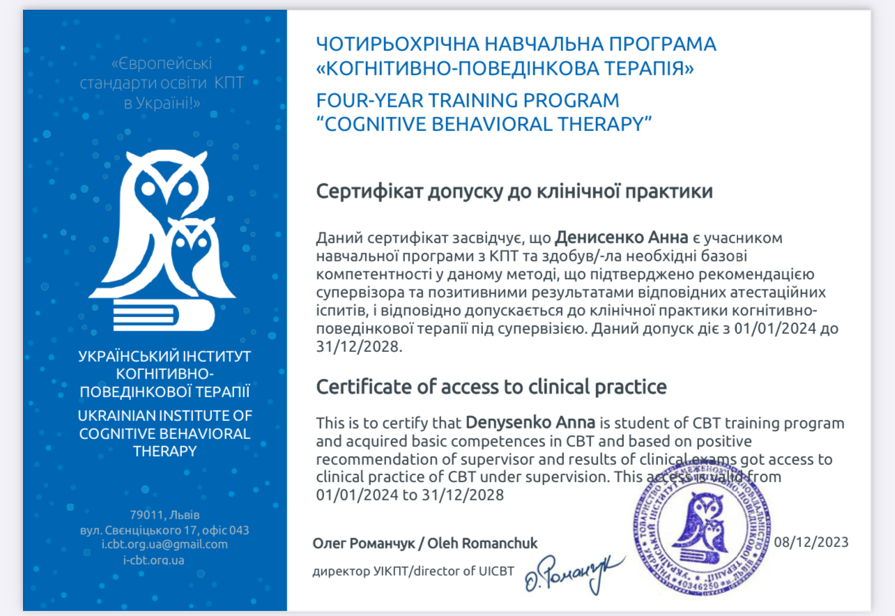 Наразі навчаюсь на КПТ терапевта в єдиному акредитованому університеті когнітивно-поведінкової терапії ( УІКПТ)