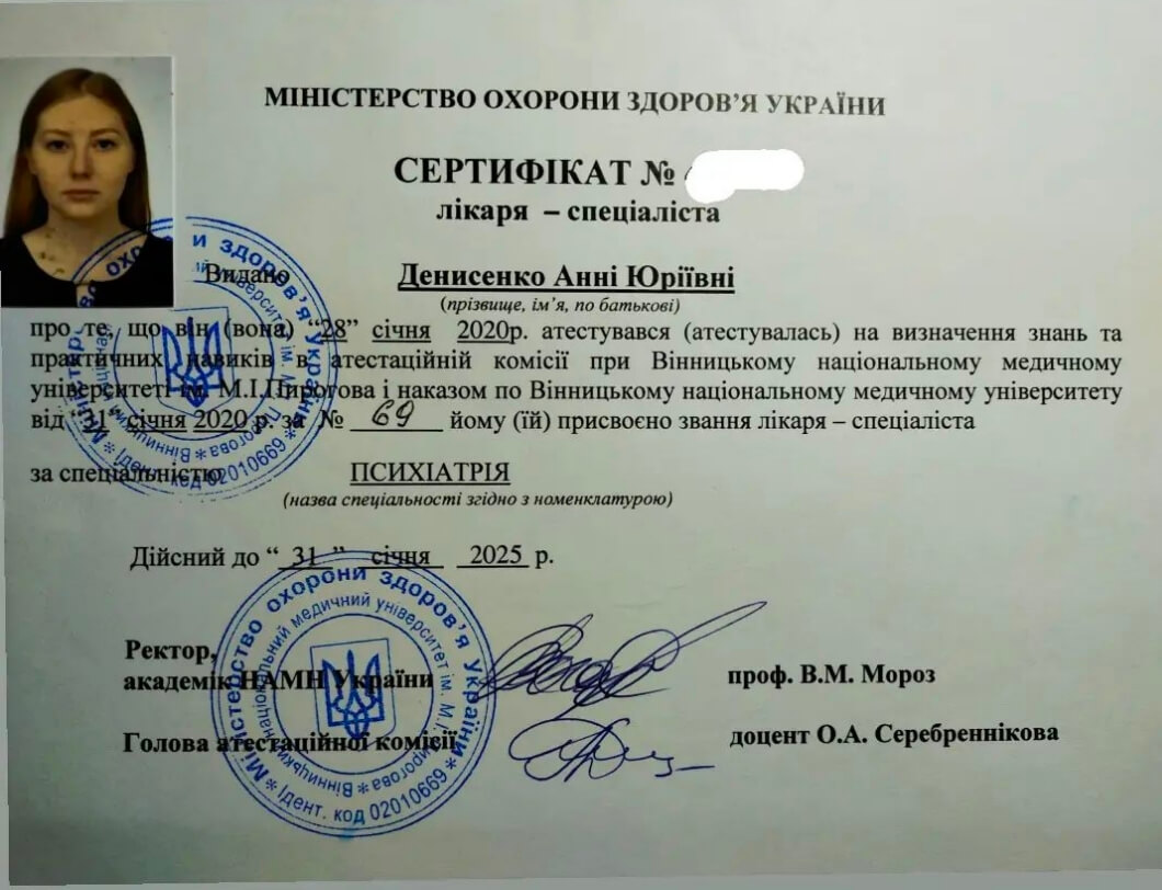 Вінницький національний медичний університет ім. Пирогова за спеціальністю лікувальна справа, спеціалізація з психіатрії.