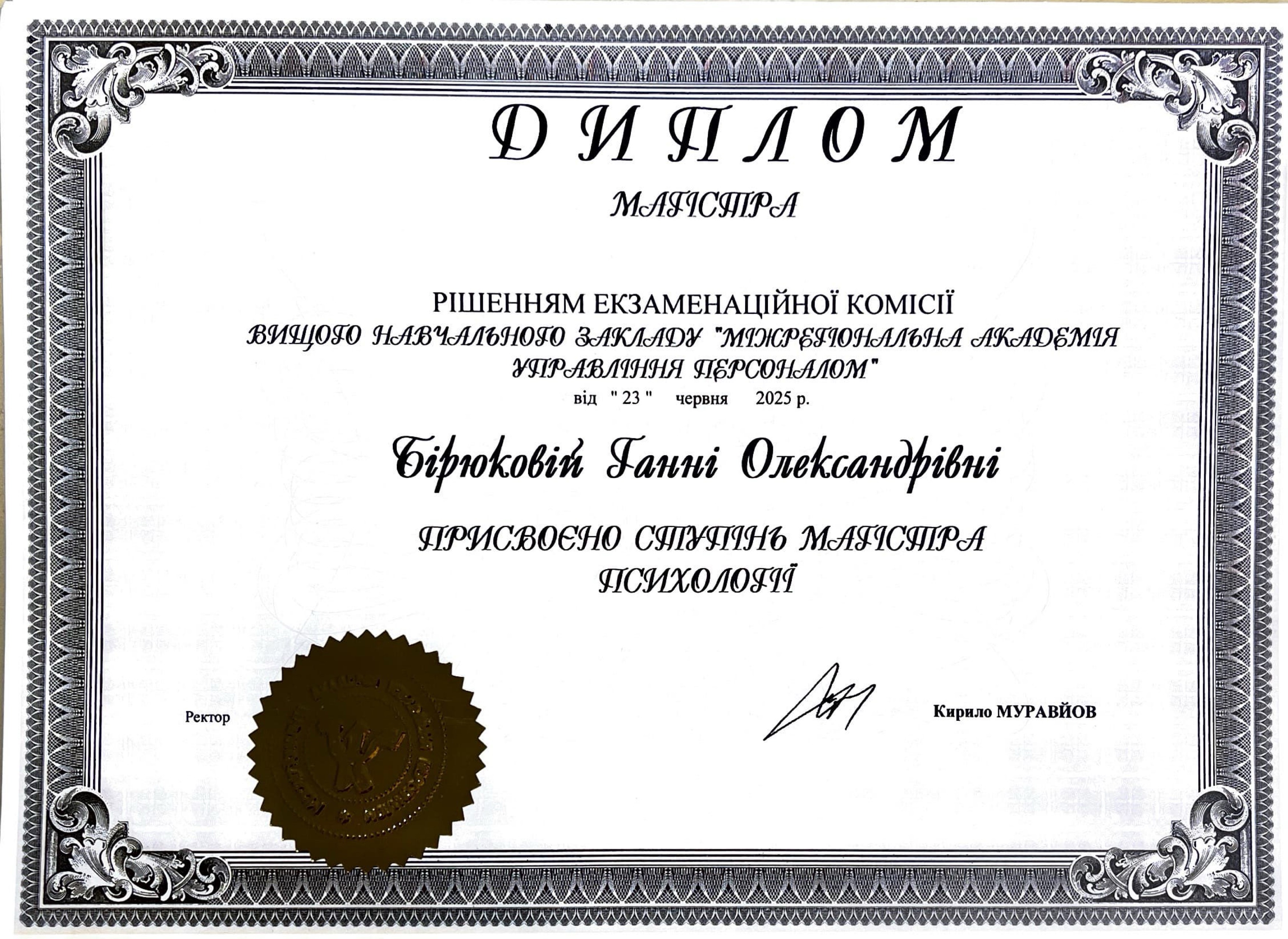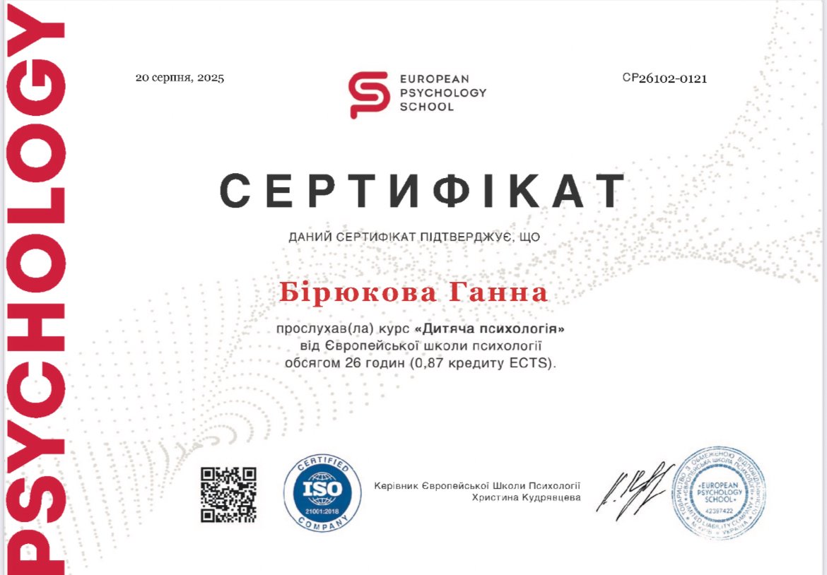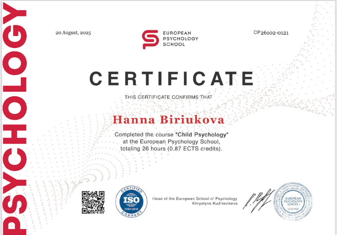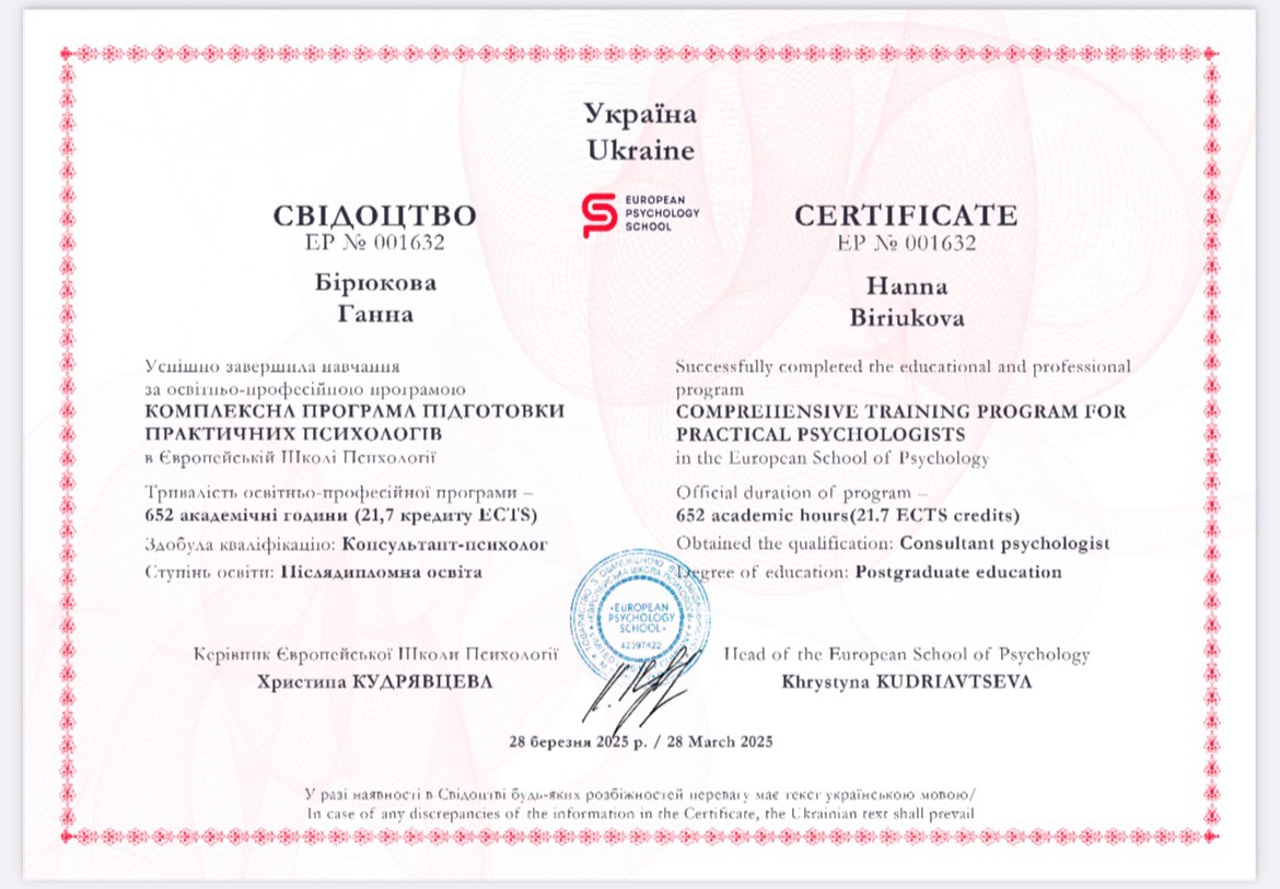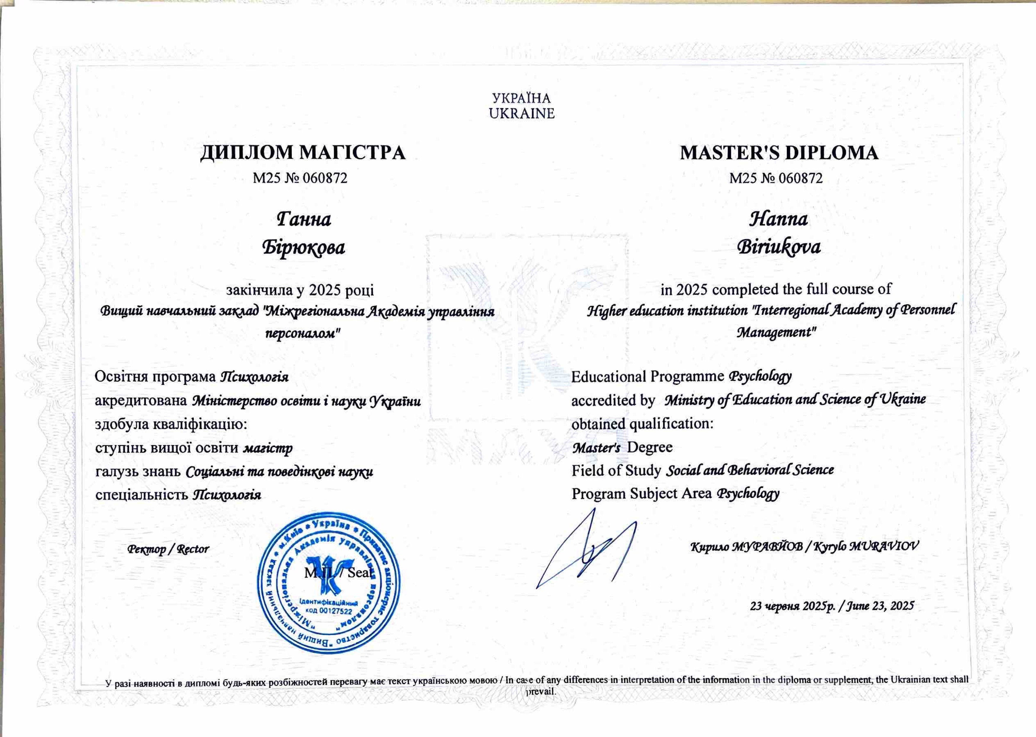 Психологія зі мною все життя: якщо вчу - то до дрібниць і розкладаю на деталі. Плаваю, вивчаю англійську, подорожую, надихаюся мистецтвом і архітектурою. Умію мислити позитивно й радіти простому. Маю власний досвід складних стосунків із батьками, переїздів і життя за кордоном — це дало мені витривалість, емпатію та повагу до чужих історій. Я ціную чесність, глибину і тепло в стосунках — і будую своє життя так, щоб у ньому було місце і для розвитку, і для радості.