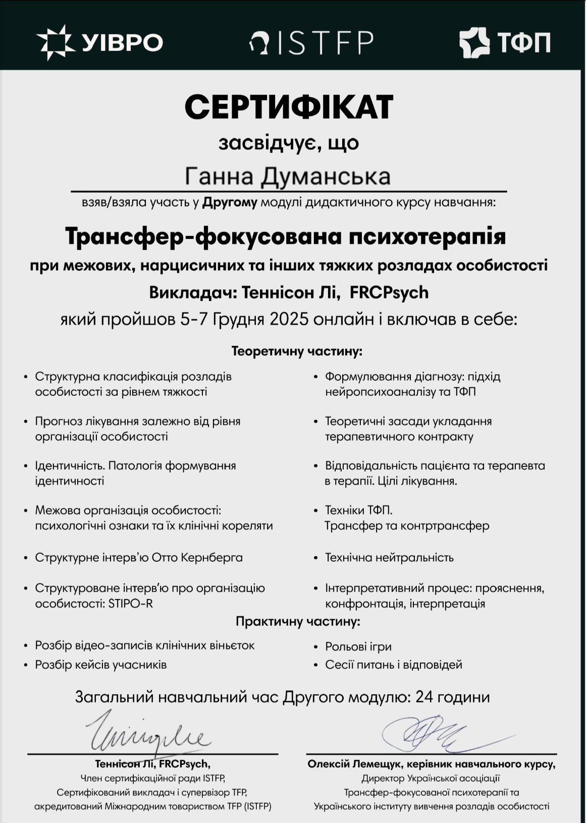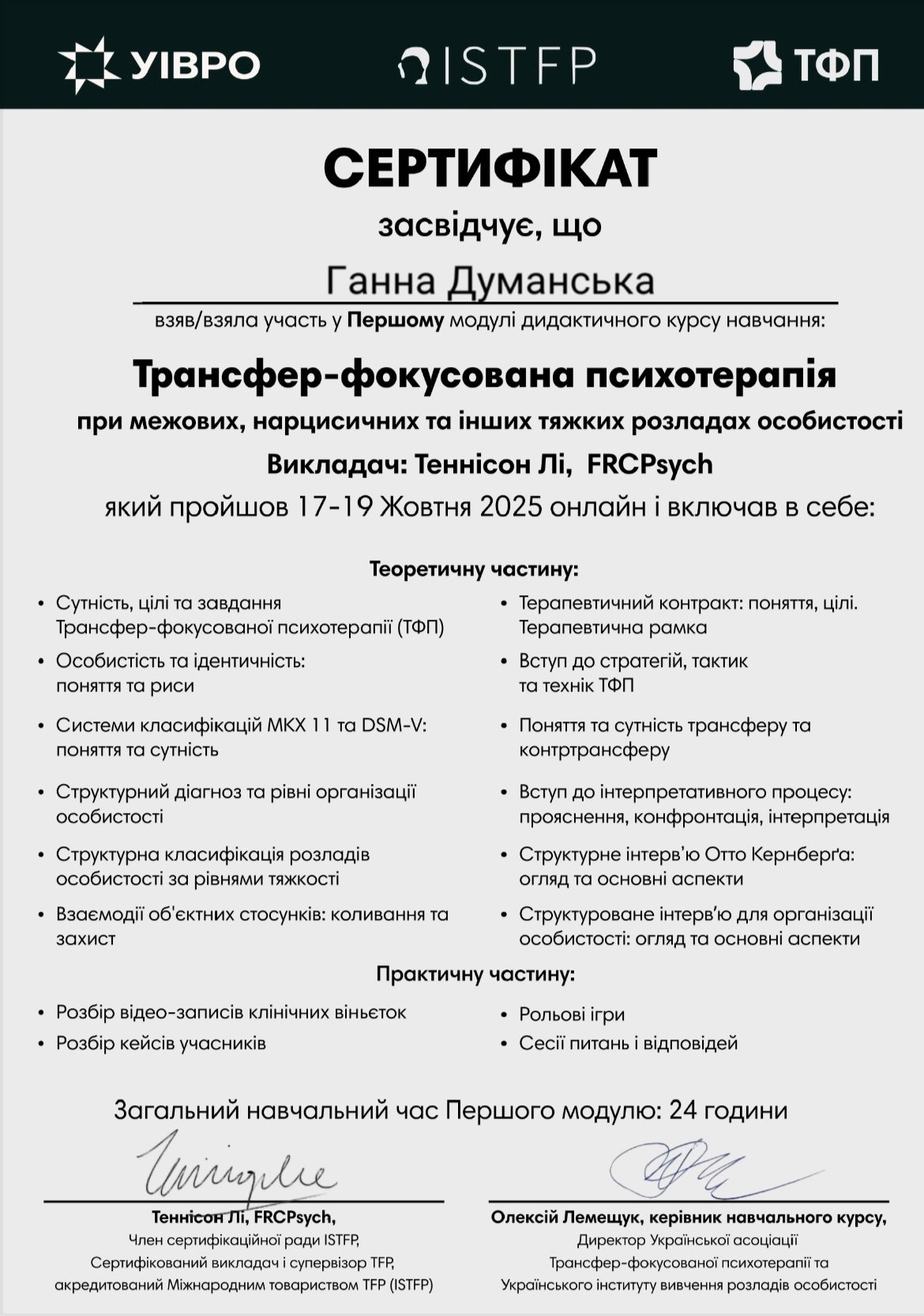Також навчаюсь дидактичному методу ТФП для роботи з нарцисичними та межовими розладами особистості