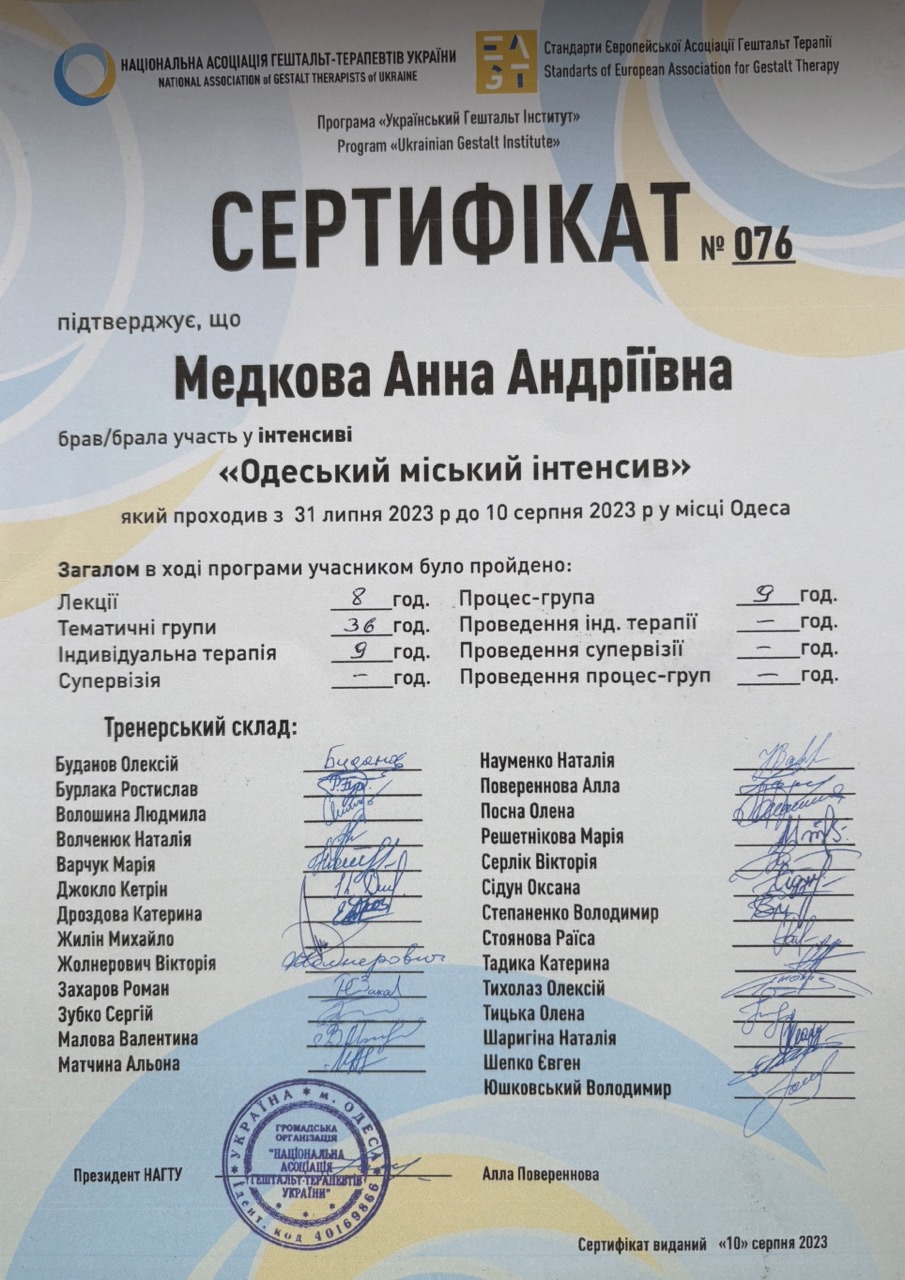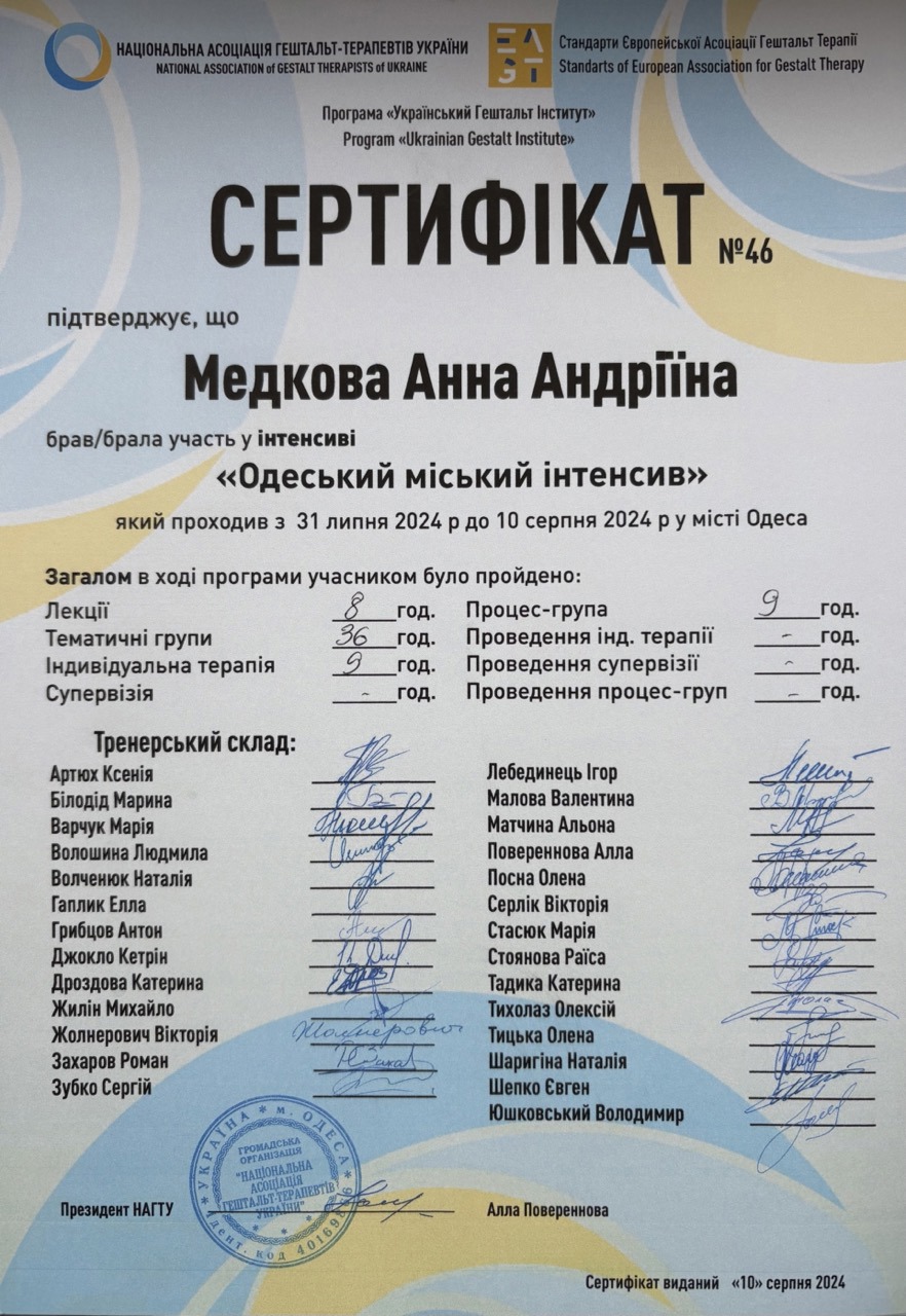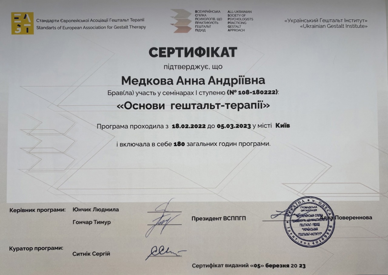 💚 в одному я - дипломований медичний психолог, психотерапевт у гештальт-підході, закінчую навчання на другому ступені і в спеціалізаціїї по співзалежній поведінці. Маю за плечима інтенсиви, конференції, групові терапії і 6 років особистої терапії. Крім того маю досвід переживання і зціллення від абʼюзивних стосунків, болючої дитячо-батьківських сепарації та кризи в стосунках з самою собою.