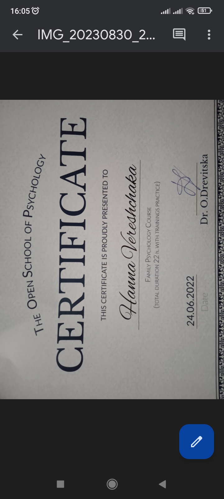 The Open School of Psychology (за напрямком сімейна психологія). 22 години