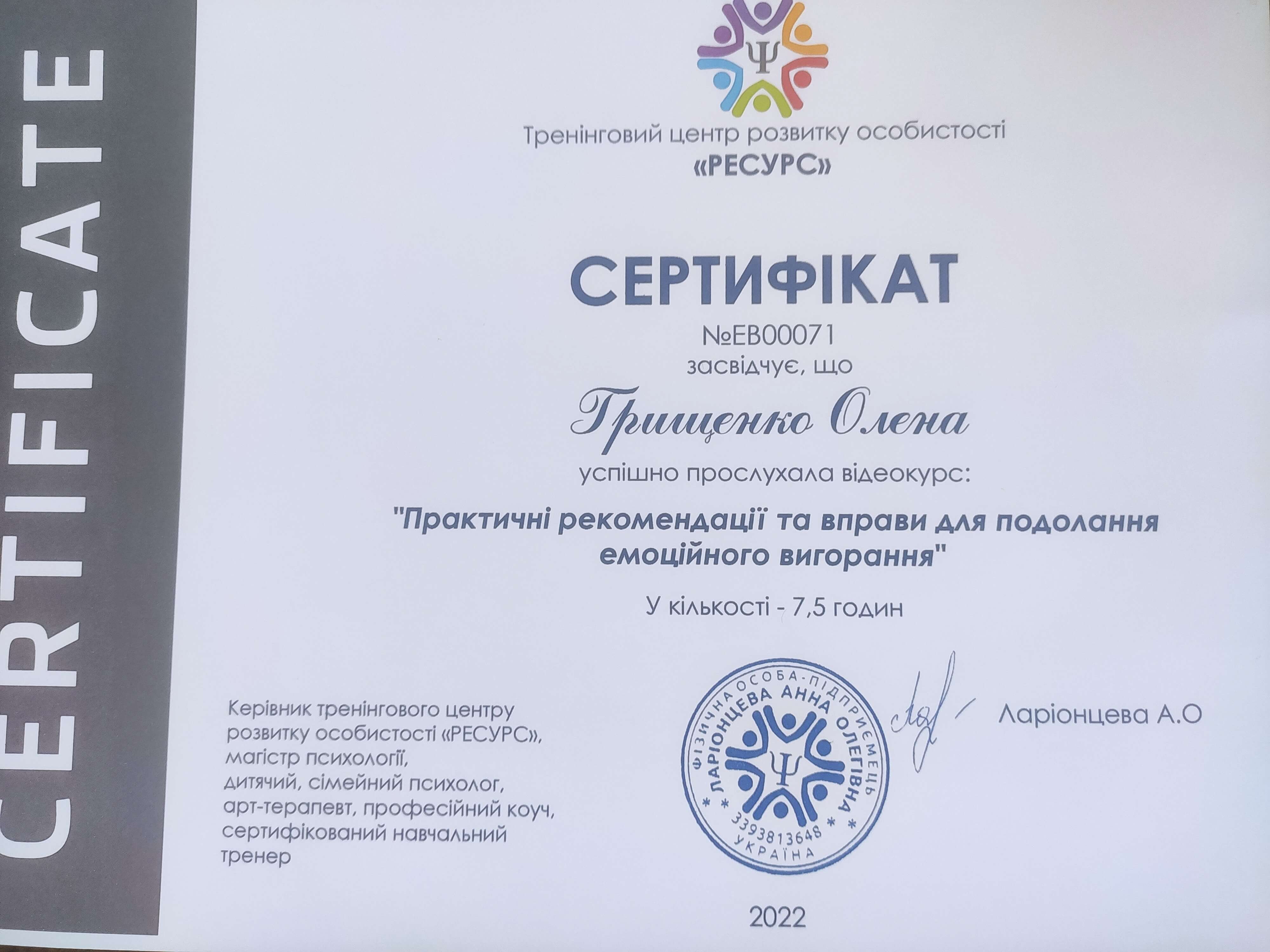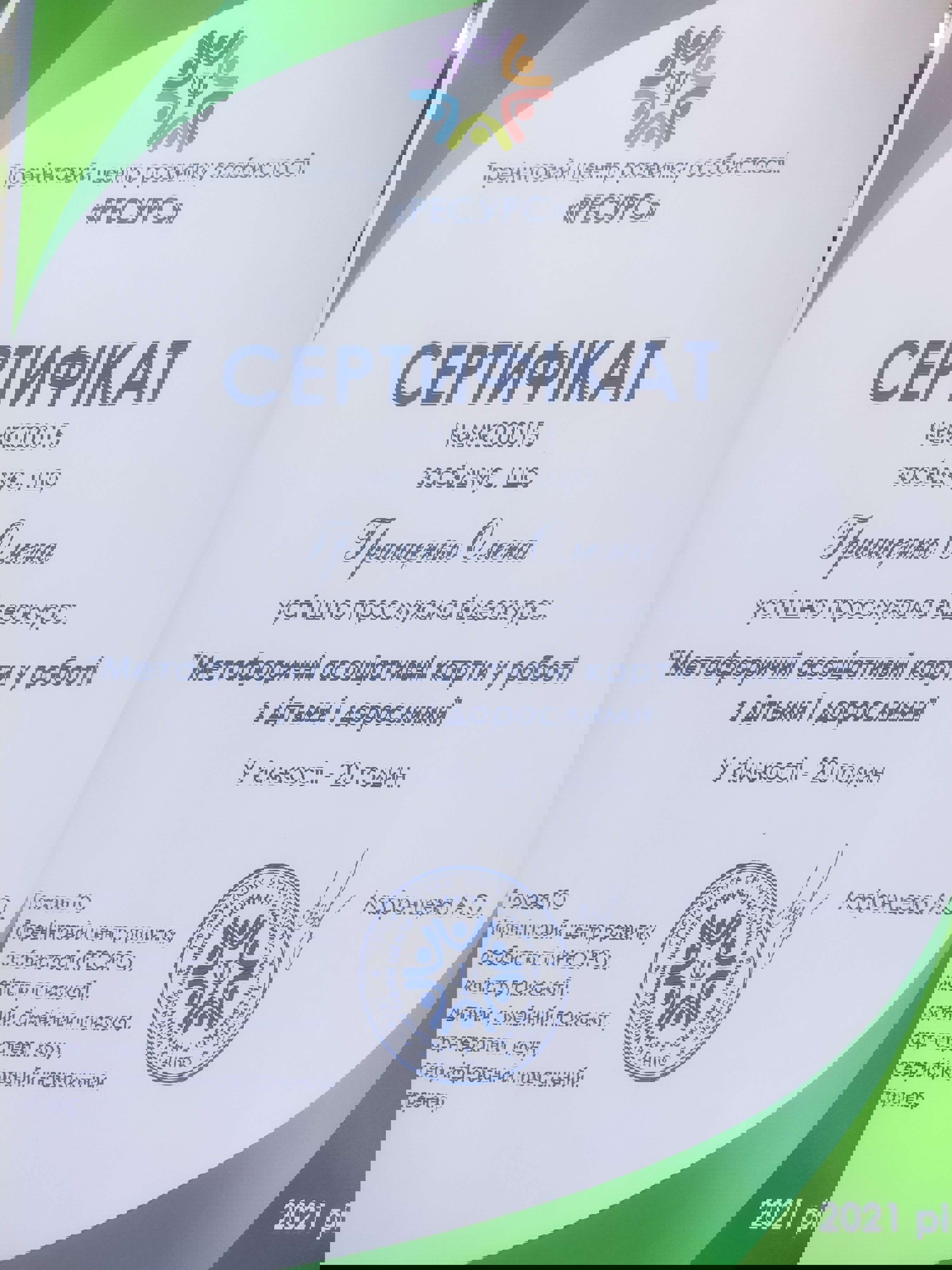 МАУП психолог, гештальт терапевт Мигис, закінчила 2ступень ,зараз навчаюсь на 3 ступені, сімейно-системні відносини ,сексологія , метафоричні карти, втрати та професійне вигорання