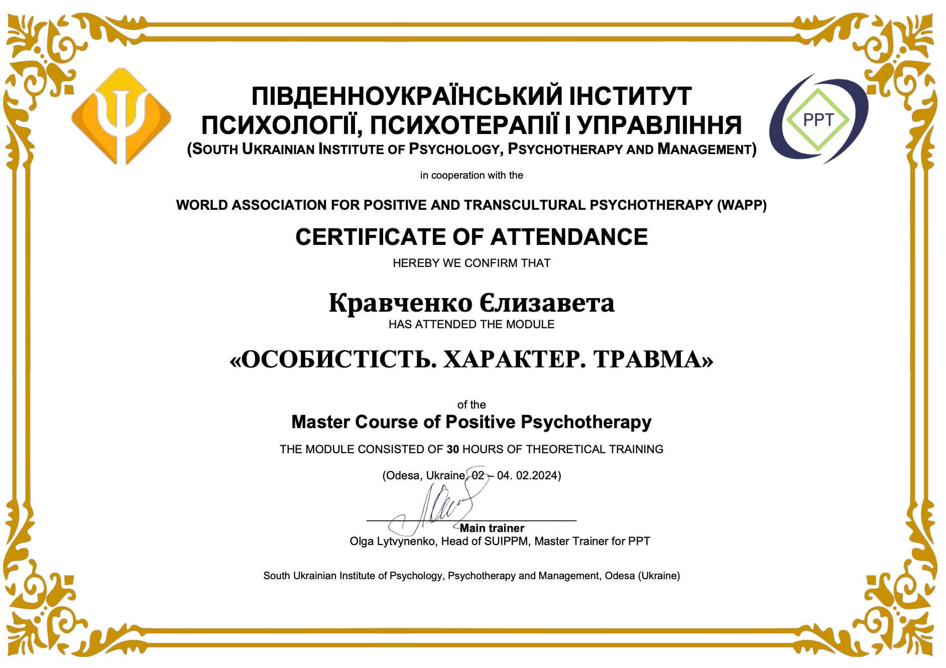 Курс по казкотерапії, курс "Арт-терапія в роботі з ПТСР у дітей", майстер-курс в методі позитивної психотерапії (навчаюсь), психосоматика та психопатологія у дітей та підлітків