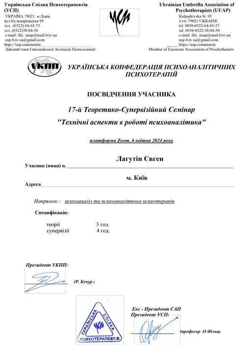 Я маю вищу психологічну освіту (магістратура, психоаналіз) і досвід індивідуальної роботи з клієнтами більше 2-х років. Також більше двох років перебуваю в особистому аналізі, що є важливою частиною моєї професійної етики. Регулярно проходжу супервізії (у тому числі групові), відвідую курси та семінари, постійно навчаюся і поглиблюю знання – як у теорії, так і в практиці.