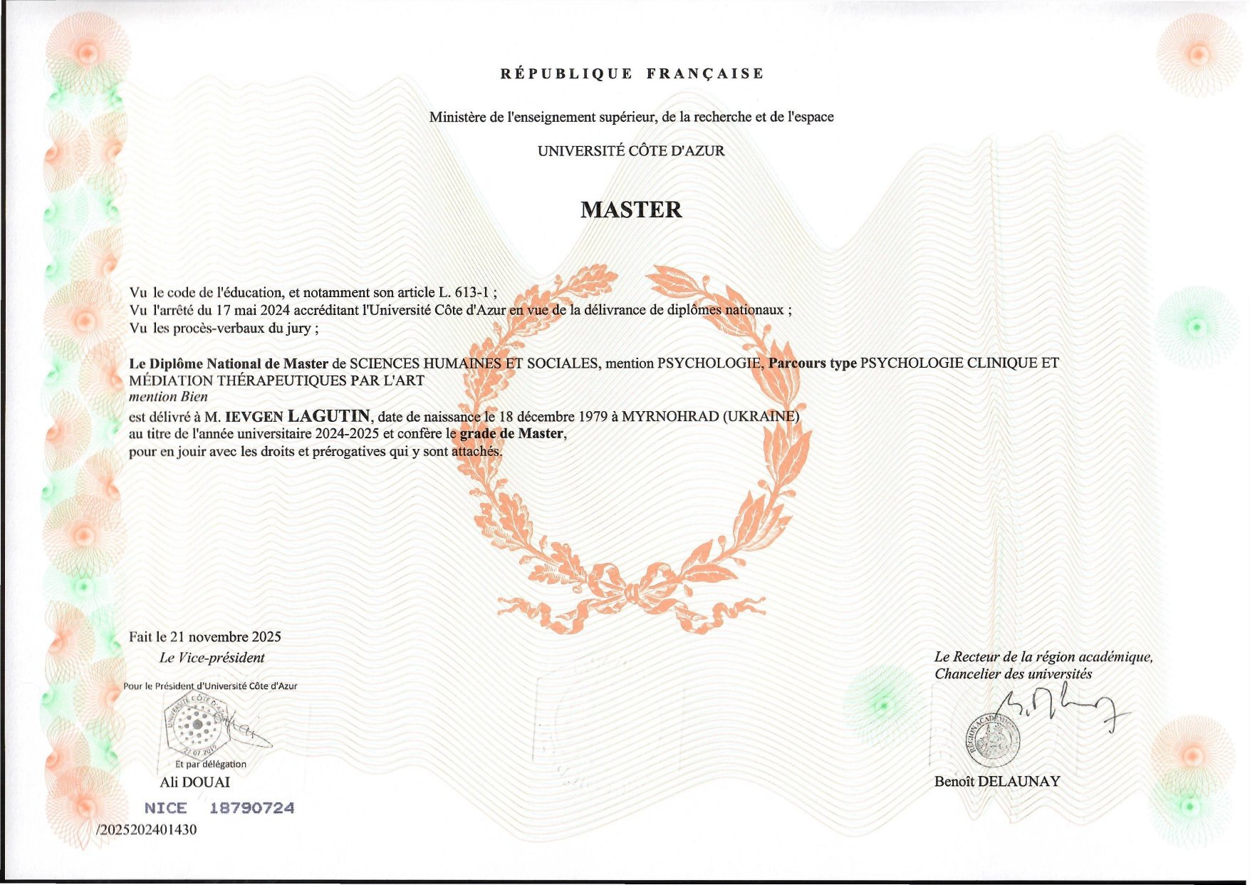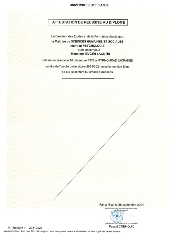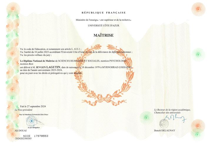 Диплом бакалавра з психології - закінчив Європейський університет, диплом магістра з клінічної психології та медіації шляхом арт-терапії - закінчив державний університет Université Côte d’Azur (Ніцца, Франція).