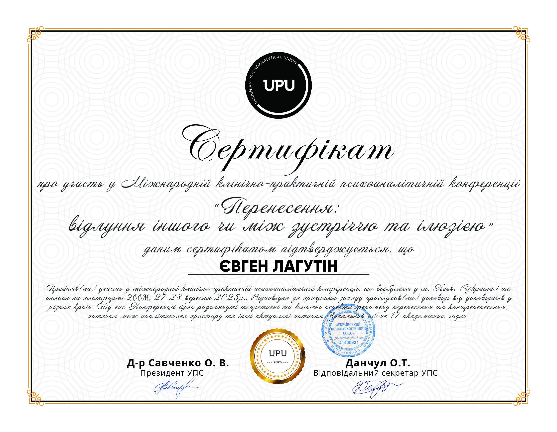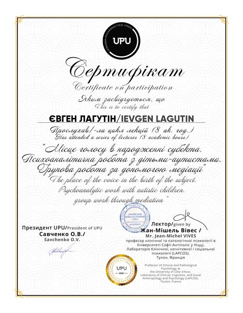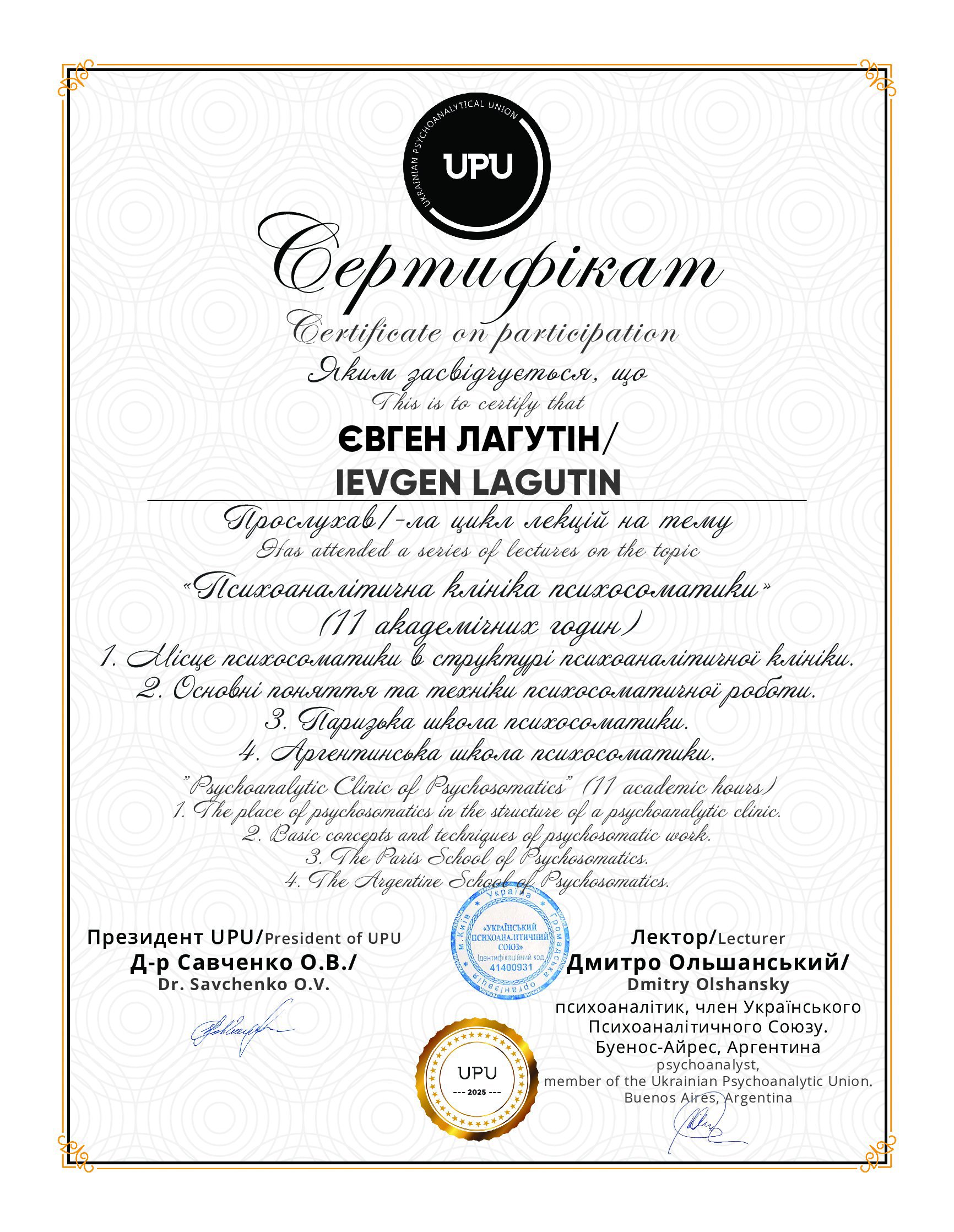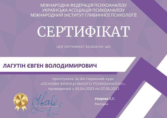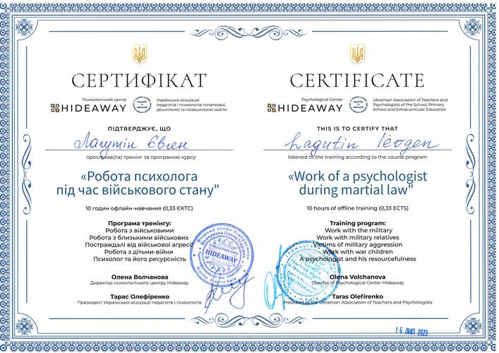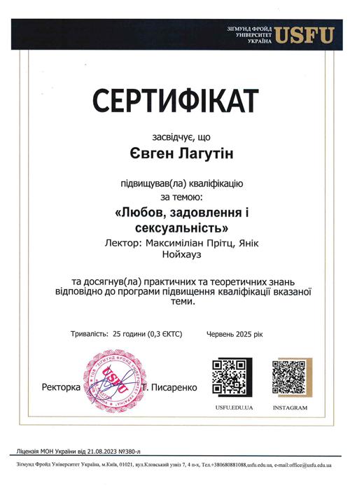 Навчаюсь на курсах підвищення кваліфікації «Психодинамічна психотерапія» в Київському інституті сучасної психології та психотерапії. Закінчив курси "Комплексний тренінг діагностики особистості за О.Кернбергом STIPO-R" в Українському інституті вивчення розладів особистості. Закінчив курси "Основи французського психоаналізу" в Українській асоціації психоаналізу. Закінчив курси підвищення кваліфікації "Любов, задоволення і сексуальність" у Зігмунд Фройд Університет Україна та багато інших курсів.