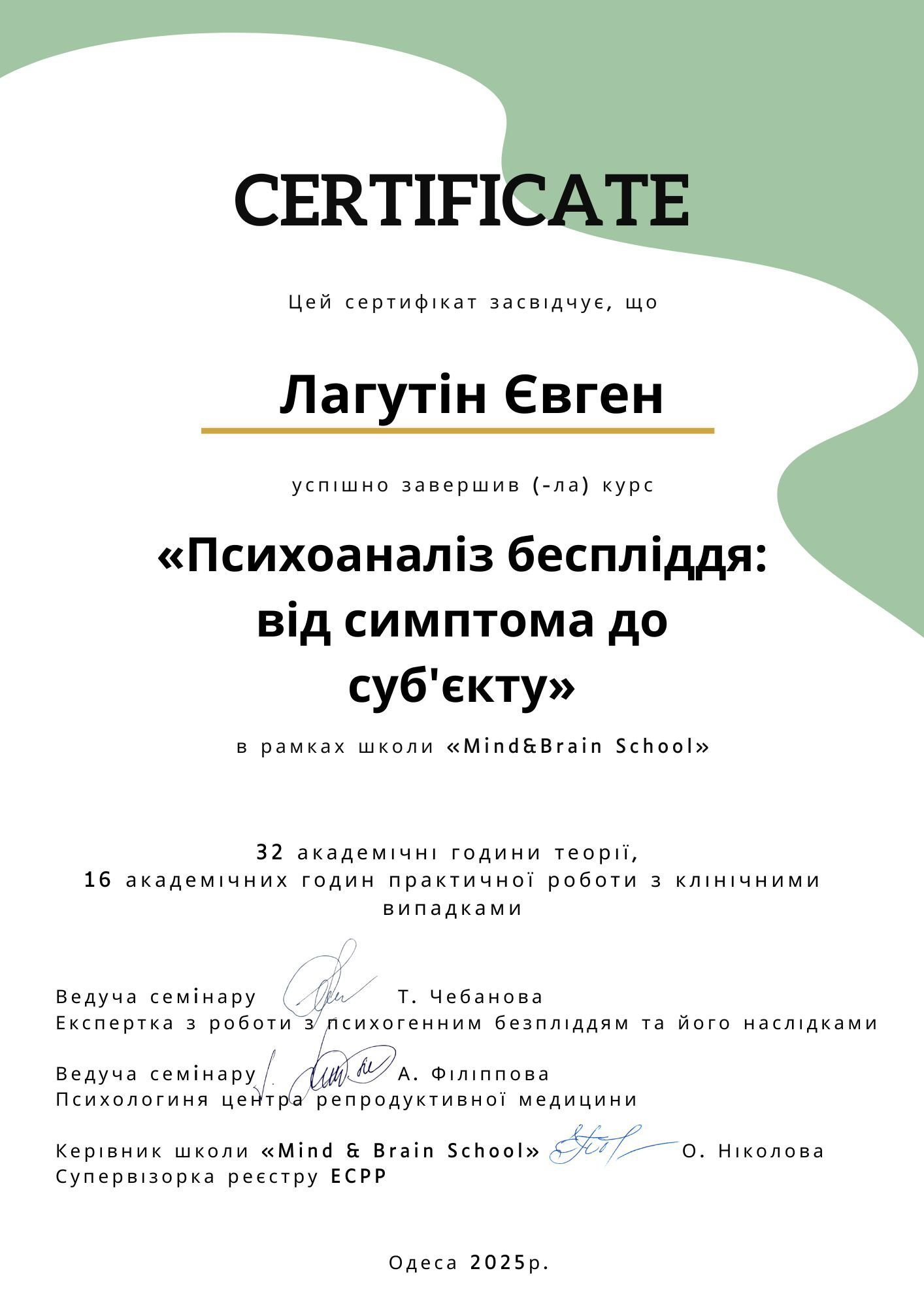Навчаюсь на курсах підвищення кваліфікації «Психодинамічна психотерапія» в Київському інституті сучасної психології та психотерапії. Закінчив курси "Комплексний тренінг діагностики особистості за О.Кернбергом STIPO-R" в Українському інституті вивчення розладів особистості. Закінчив курси "Основи французського психоаналізу" в Українській асоціації психоаналізу. Закінчив курси підвищення кваліфікації "Любов, задоволення і сексуальність" у Зігмунд Фройд Університет Україна та багато інших курсів.