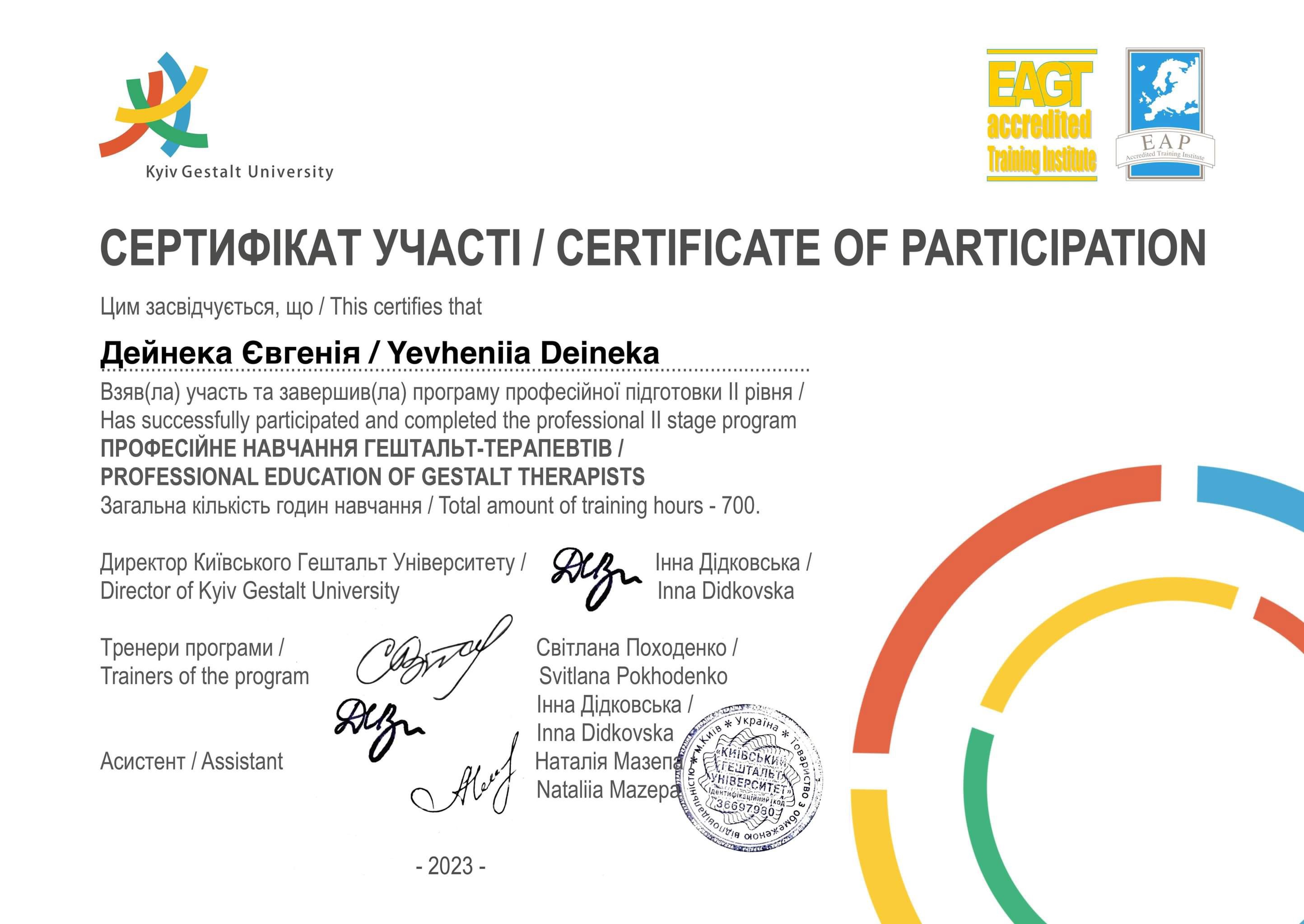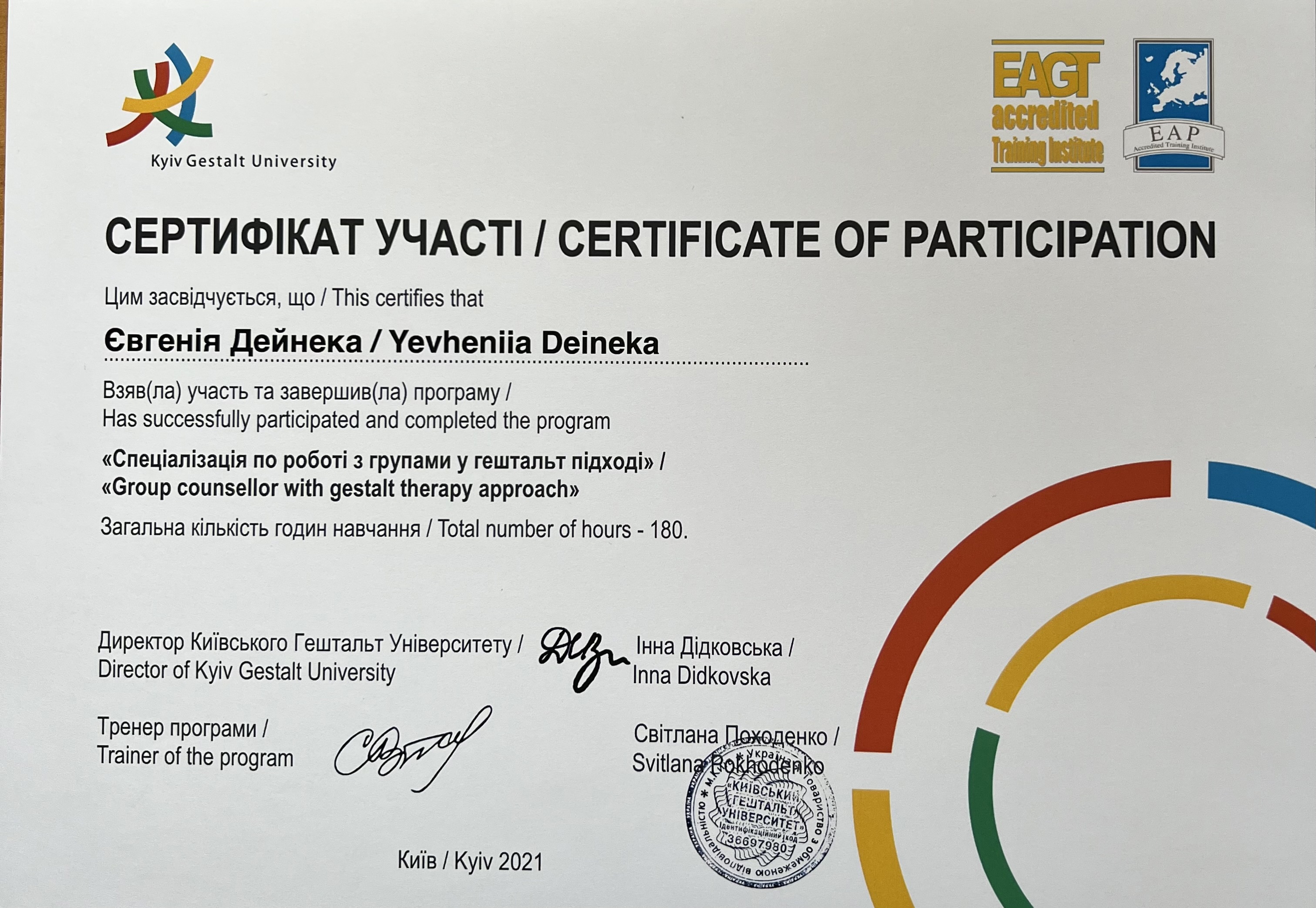 Мене звати Євгенія Дейнека, я — психолог, гештальт-терапевт, ведуча терапевтичних груп.