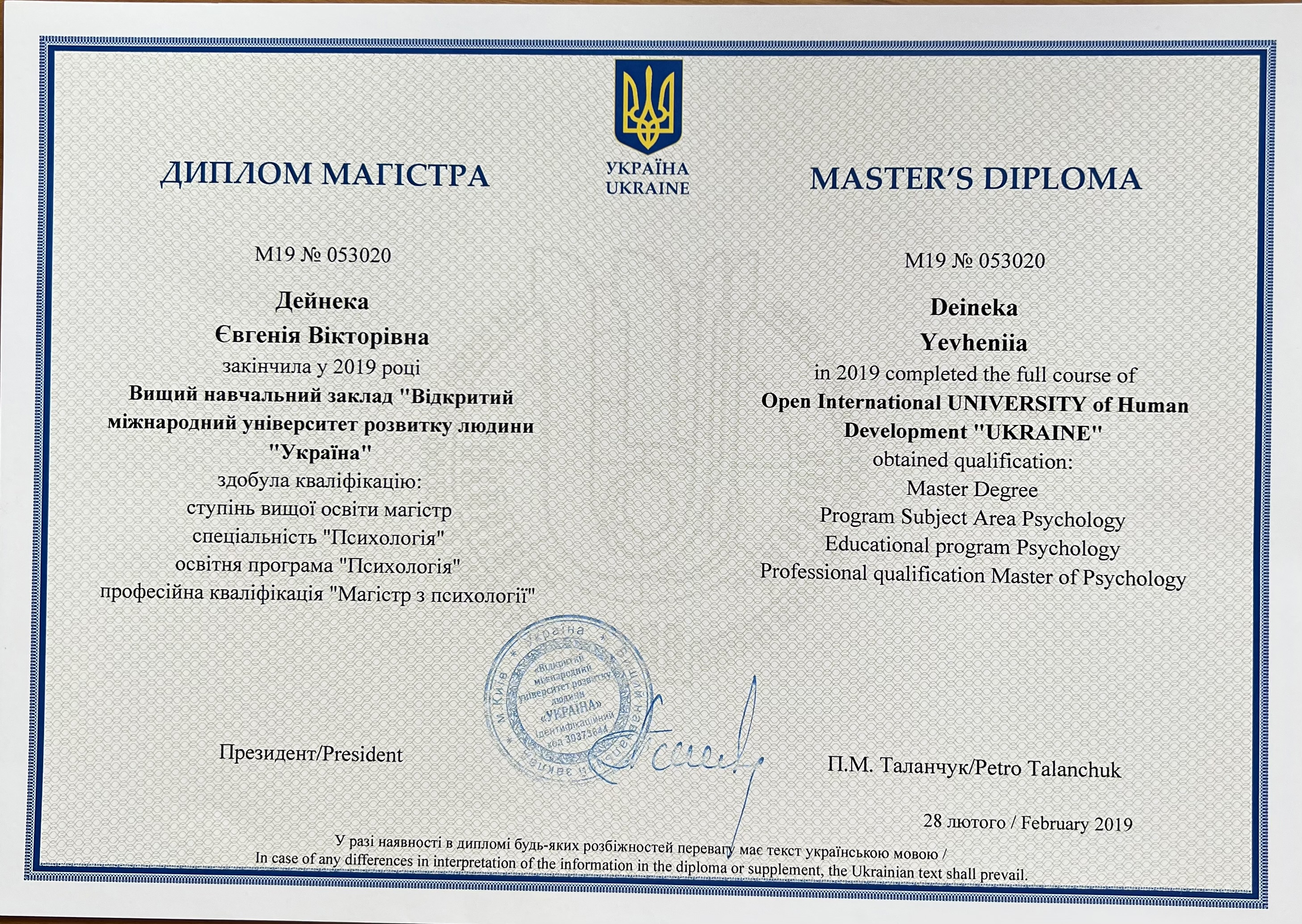 Я Магістр психології закінчила «Вищий навчальний заклад "Відкритий міжнародний університет розвитку людини