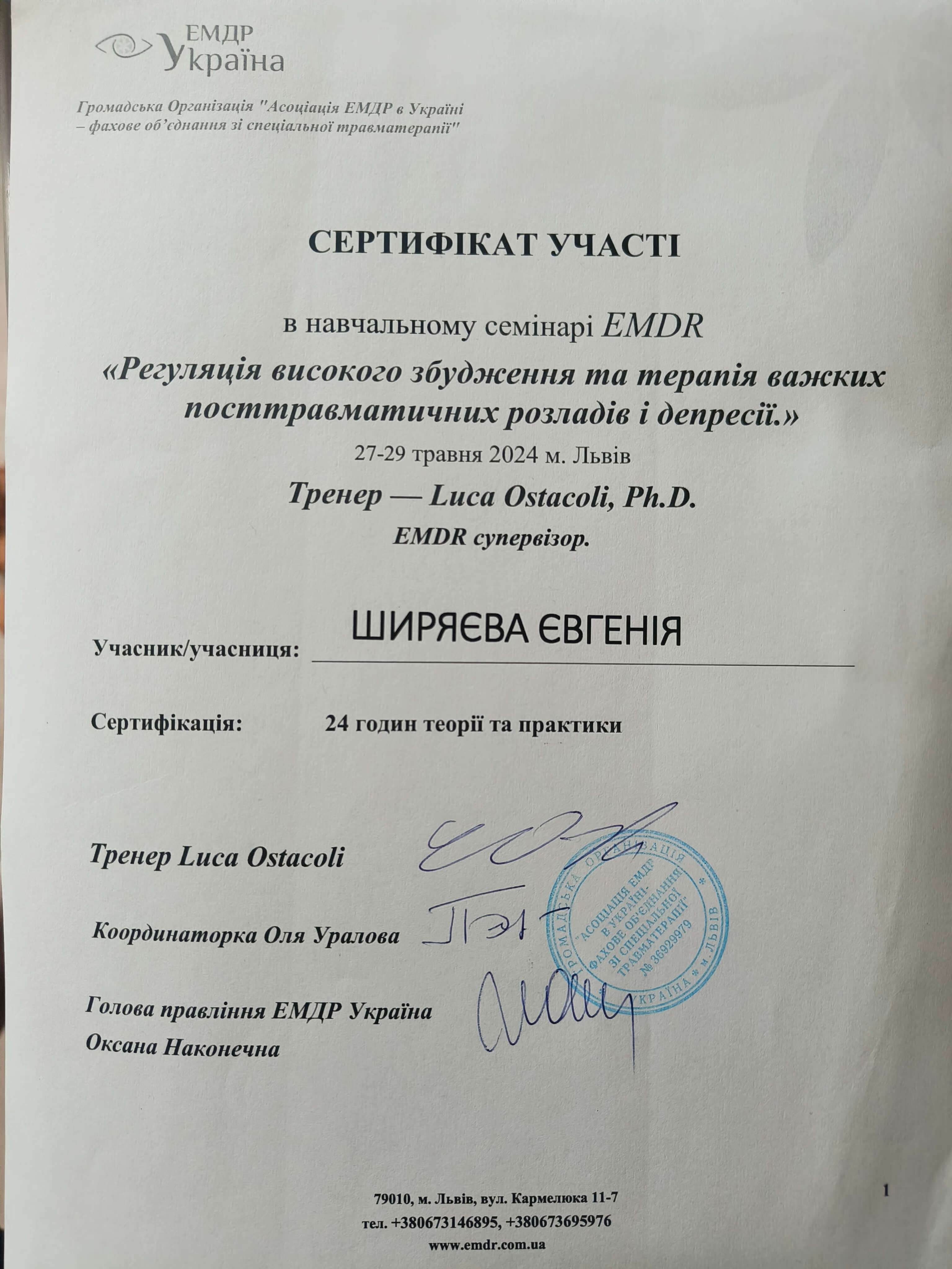 Психотерапевт, сертифікована у Харківському інституті гештальт-терапії.