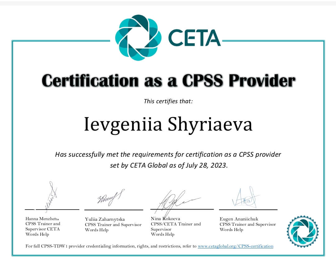 Зустрічі проходять у теплій, дружній атмосфері. З прийняттям та розумінням я чую та бачу кожного клієнта, даю простір, час та відчуття присутності іншого.
