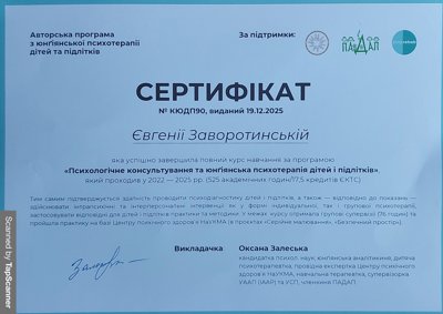 01.12.2024 - 01.08.2025 - курс підвищення кваліфікації "Безпечний простір", психологічна підтримка дошкільнят і їх батьків.