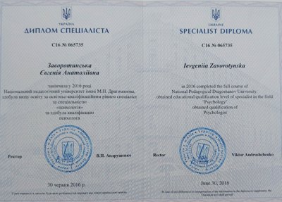 01.10.2014 – 30.06.2016, НПУ ім. М.П. Драгоманова, Cпеціаліст – Психолог