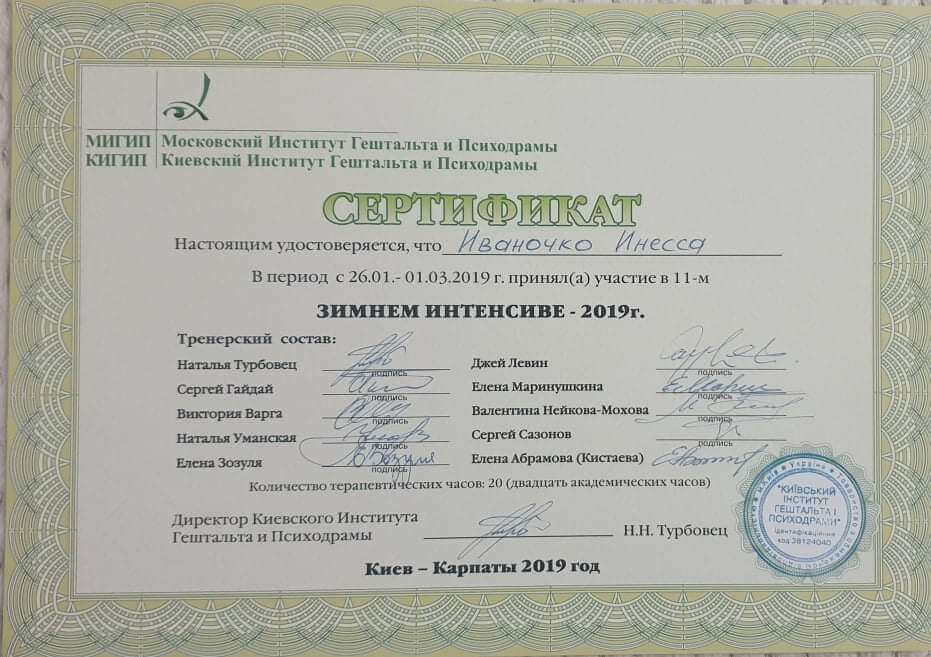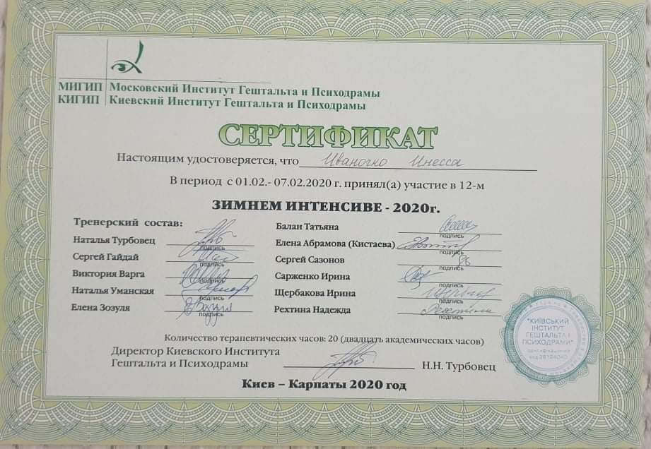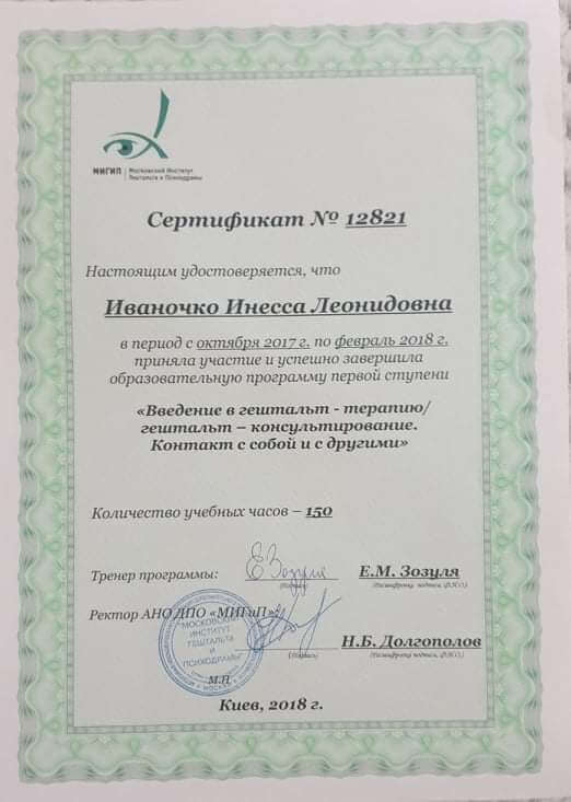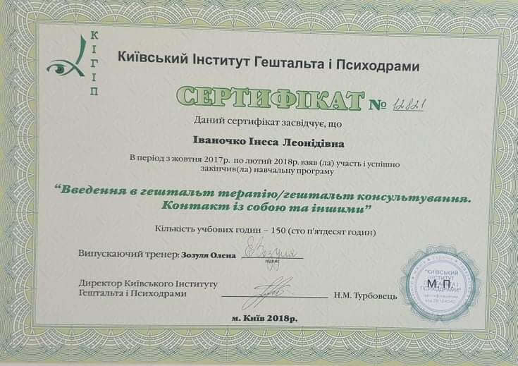 У вересні 2021 року буде сертифікація з гештальт-терапії.