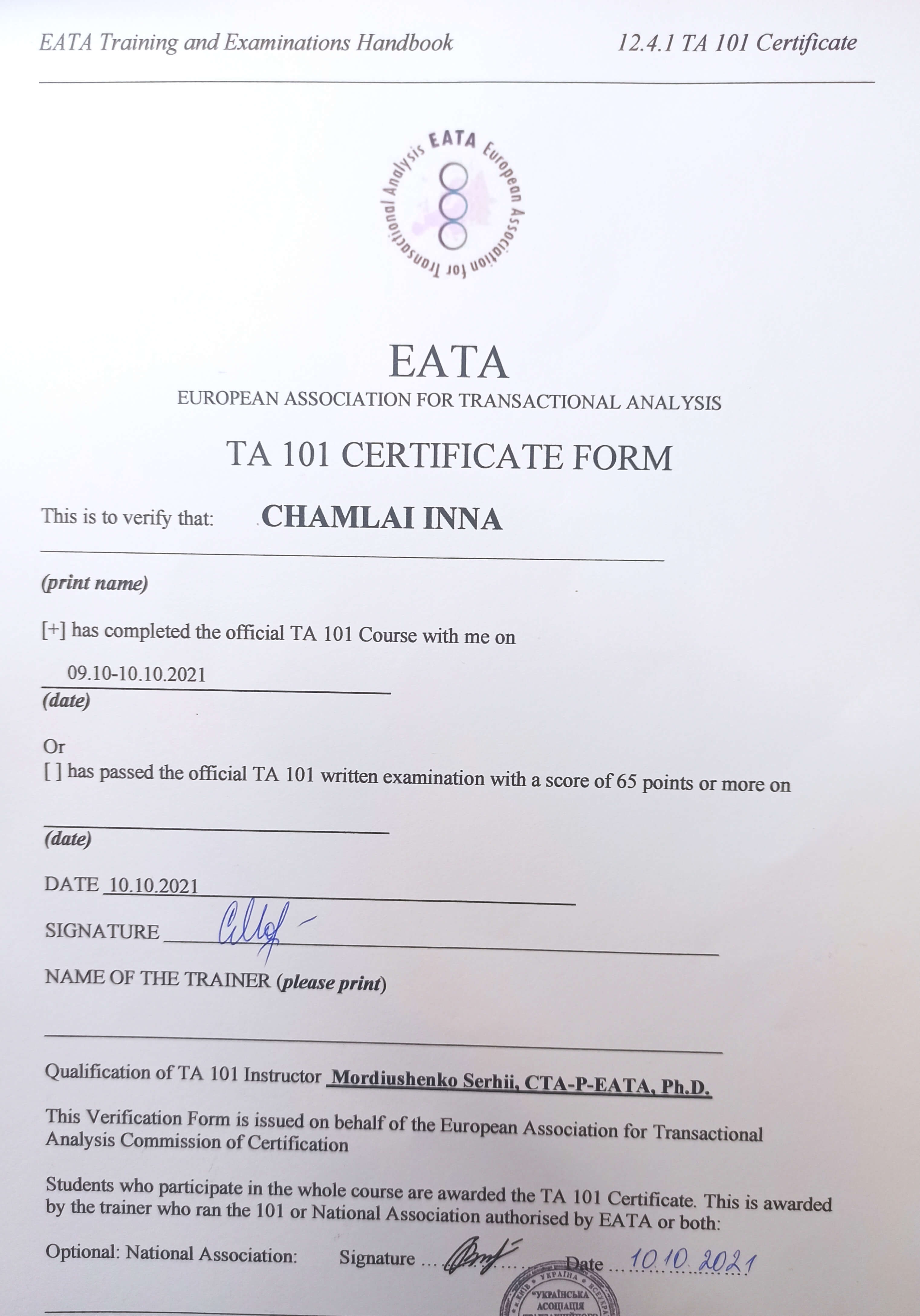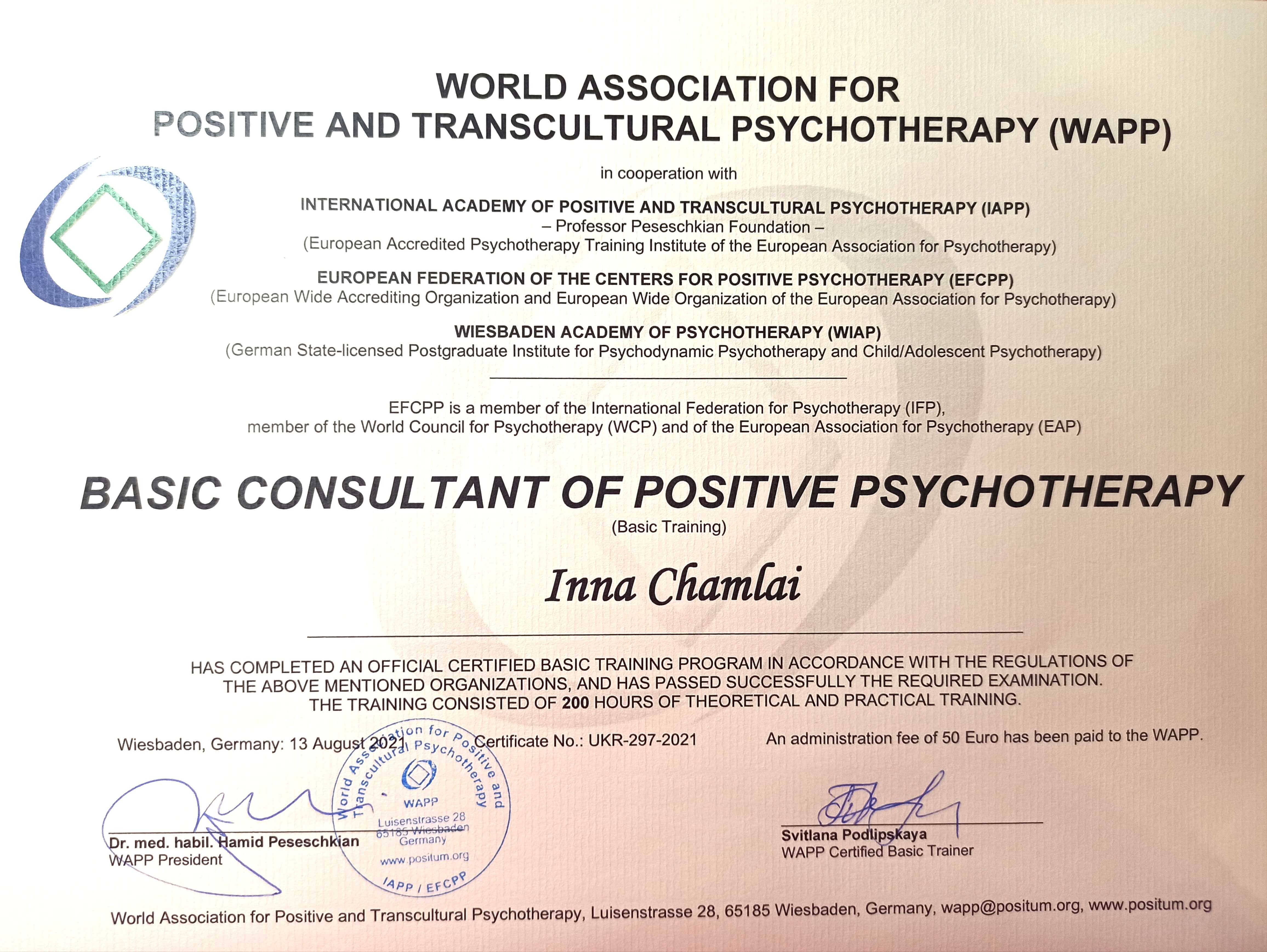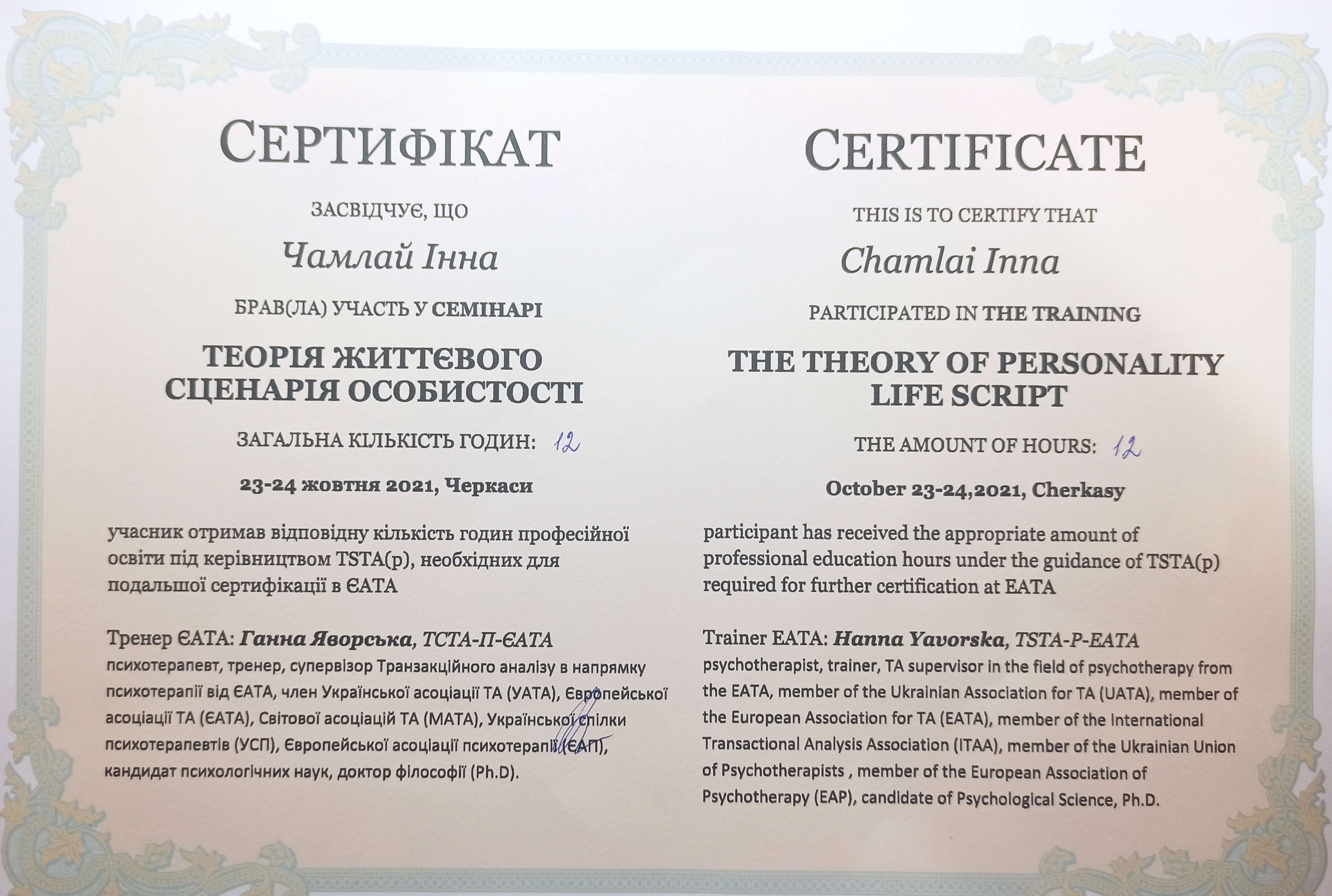 Далі післядипломна освіта у Позитивній психотерапії, спілкування з людьми, які реалізувалися у цій професії. Я розумію, що моя мрія є реальною! Починаю робити перші кроки до своєї практики, бачу, що виходить, тішуся. Продовжую навчання у методі транзактного аналізу.